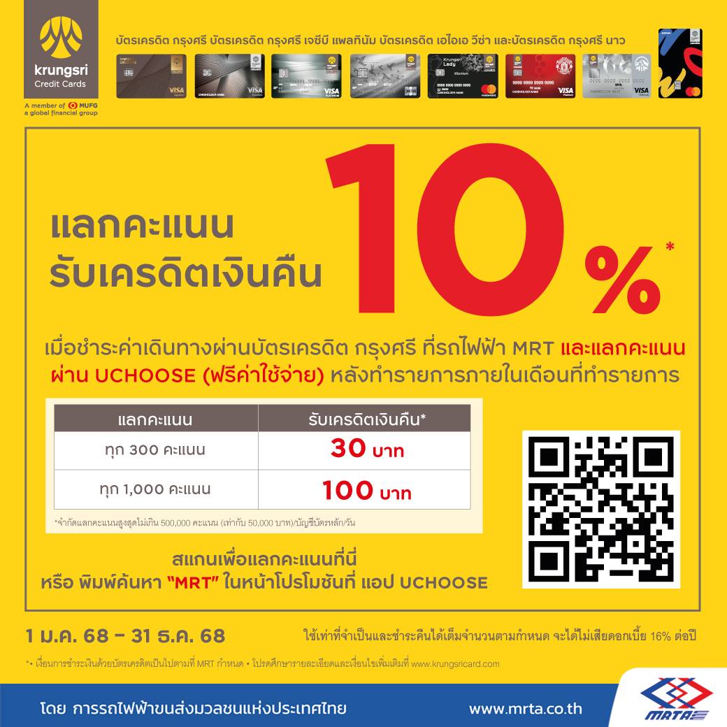2. บริษัท บัตรกรุงศรีอยุธยา จำกัด มอบสิทธิพิเศษให้ผู้ใช้บริการที่มียอดใช้จ่ายรูดหรือแตะผ่านบัตรเครดิตกรุงศรี ที่รถไฟฟ้า MRT สายสีน้ำเงินและสายสีม่วง แลกกรุงศรี พอยต์ทุก 300 พอยต์ จะได้รับเครดิตเงินคืน 30 บาท และแลกกรุงศรีพอยต์ทุก 1,000 พอยต์ จะได้รับเครดิตเงินคืน 100 บาท โดยจำกัดการแลกเครดิตเงินคืน 50,000 บาท/บัญชีบัตรหลัก/วัน ตั้งแต่วันที่ 1 มกราคม – 31 ธันวาคม 2568 รายละเอียดเพิ่มเติมโทร. 0 2646 3555 หรือ www.krungsricard.com (หมายเหตุ: เฉพาะ MRT สายสีน้ำเงิน โปรโมชันร่วมการแตะจ่ายผ่านบัตรเท่านั้น)
