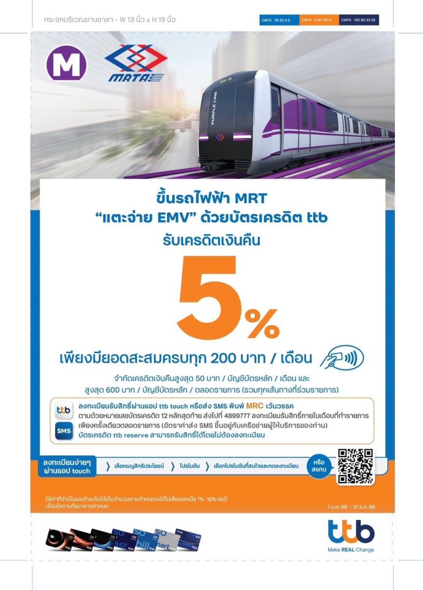 5. ธนาคารทหารไทยธนชาต จำกัด (มหาชน) มอบสิทธิประโยชน์ให้แก่ผู้ใช้บริการรถไฟฟ้าที่ใช้บัตรเครดิตของธนาคารแตะชำระค่าโดยสารที่ประตูอัตโนมัติ จะได้รับเครดิตเงินคืน 5% สะสมครบ 200 บาท/เดือน โดยจำกัดการรับเครดิตเงินคืนรวมสูงสุด 50 บาท/คน/เดือน และสูงสุด 600 บาท ตั้งแต่วันที่ 1 มกราคม – 31 ธันวาคม 2568 ณ ห้องออกบัตรโดยสารรถไฟฟ้า MRT สายสีน้ำเงินและสายสีม่วง รายละเอียดเพิ่มเติมโทร. 1428 หรือ www.ttbbank.com