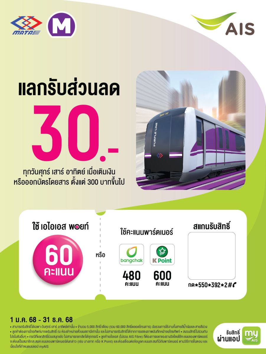 3. บริษัท แอดวานซ์ ไวร์เลส เน็ทเวอร์ค จำกัด มอบส่วนลด 30 บาท ให้แก่ลูกค้าเอไอเอสที่เติมเงินหรือออกบัตรโดยสาร เป็นเงินตั้งแต่ 300 บาทขึ้นไป/รายการและใช้คะแนน 60 พอยต์ ณ ห้องออกบัตรโดยสารรถไฟฟ้า MRT สายสีม่วง ทุกวันศุกร์ วันเสาร์ และวันอาทิตย์ ตั้งแต่วันที่ 1 มกราคม – 31 ธันวาคม 2568 รายละเอียดเพิ่มเติมโทร. 1175 หรือ www.ais.th/consumers