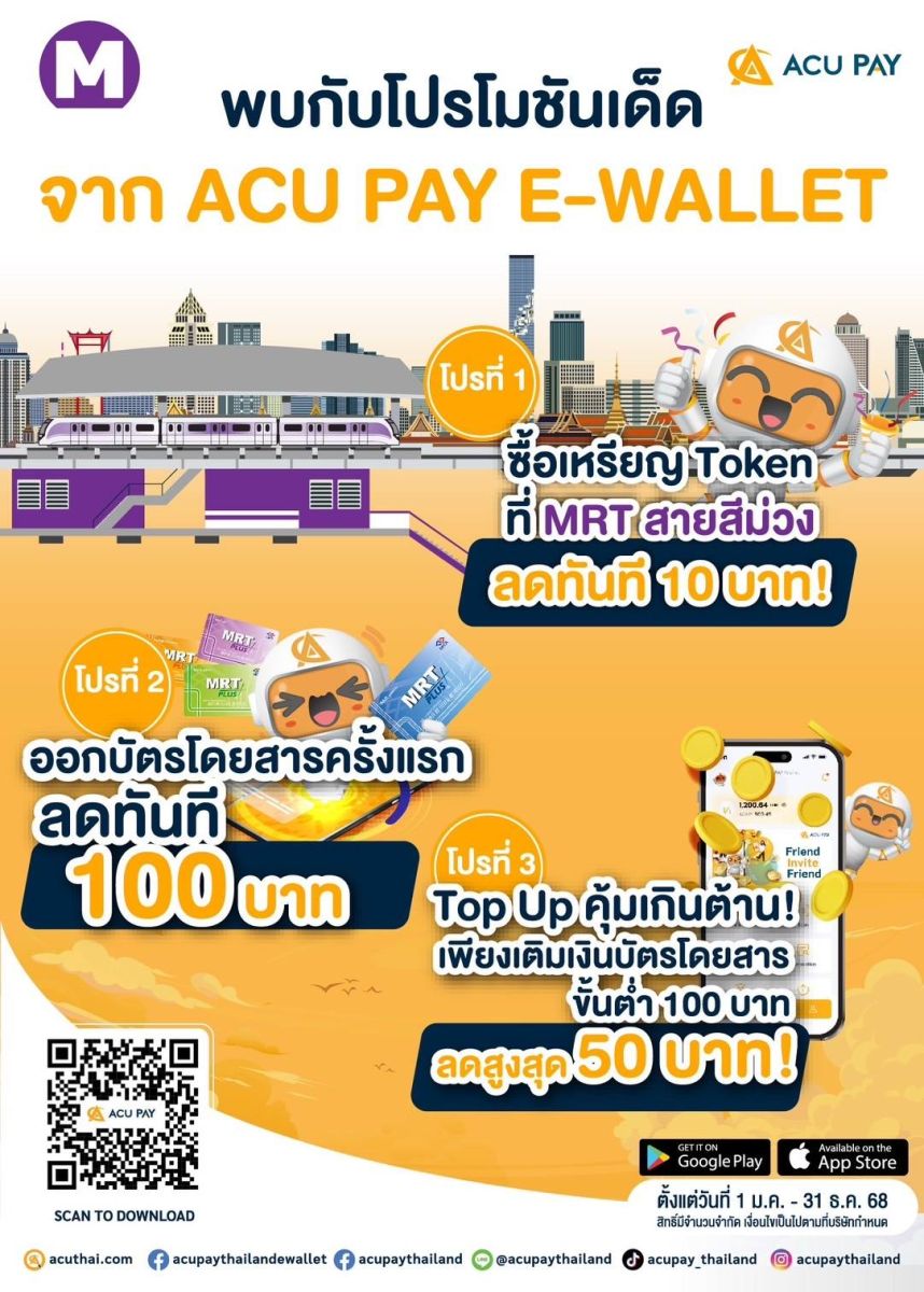 8. บริษัท เอซียู เพย์ (ไทยแลนด์) จำกัด มอบสิทธิประโยชน์ให้แก่ผู้ใช้บริการรถไฟฟ้าเพิ่มช่องทางการรับชำระค่าโดยสารผ่าน Application ACU Pay และมอบส่วนลดกรณีซื้อเหรียญโดยสาร บัตรโดยสาร หรือเติมเงิน สำหรับผู้โดยสารที่ชำระด้วย ACU e-Wallet ณ ห้องออกบัตรโดยสารรถไฟฟ้า MRT สายสีม่วง หรือใช้คะแนนสะสม 7,500 คะแนน แทนเงินสด 30 บาท ตั้งแต่วันที่ 1 มกราคม – 31 ธันวาคม 2568 รายละเอียดเพิ่มเติมโทร. 0 2114 3376 หรือ www.acuthai.com