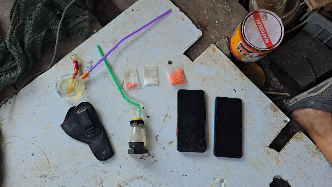 ตรวจสอบบริเวณที่ผู้ต้องหานั่งอยู่ พบยาเสพติดให้โทษประเภท 1 (ยาบ้า) จำนวน 113 เม็ด ยาไอซ์น้ำหนักรวม 2 กรัม โทรศัพท์มือถือจำนวน 2 เครื่อง ซองใส่ปืนจำนวน 1 อัน และอุปกรณ์การเสพหลายรายการ ส่วนอาวุธปืน ผู้ต้องหาให้การรับสารภาพว่าได้ทิ้งอาวุธปืนที่ยิงต่อสู้เจ้าหน้าที่ตำรวจลงน้ำ ส่วนยาเสพติดรับว่าเป็นของตนเองและหมายจับข้างต้นรับว่าตนเป็นผู้ที่มีชื่อในหมายจับและยังไม่เคยถูกจับมาก่อน