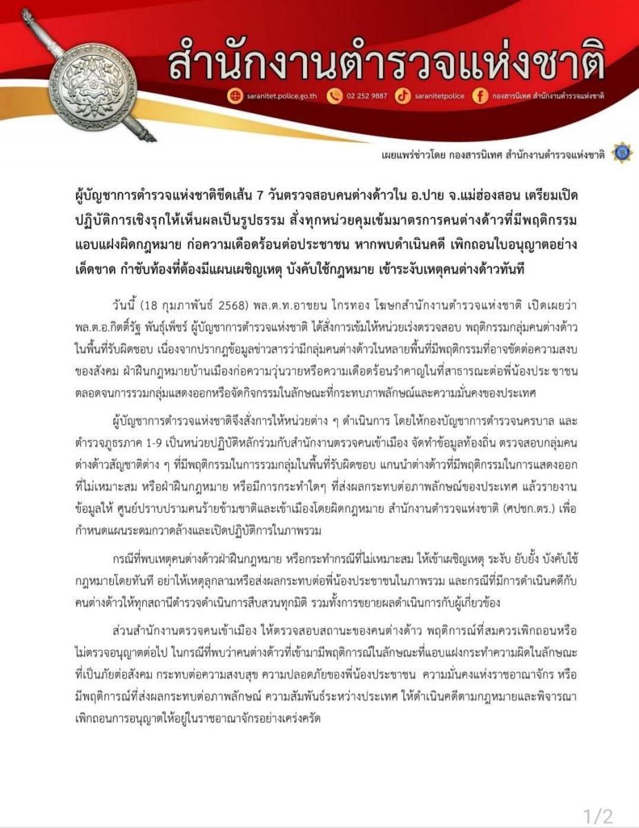 วันนี้ (18 กุมภาพันธ์ 2568) พล.ต.ท.อาชยน ไกรทอง โฆษกสำนักงานตำรวจแห่งชาติ เปิดเผยว่า พล.ต.อ.กิตติ์รัฐ พันธุ์เพ็ชร์ ผู้บัญชาการตำรวจแห่งชาติ ได้สั่งการเข้มให้หน่วยเร่งตรวจสอบ พฤติกรรมกลุ่มคนต่างด้าวในพื้นที่รับผิดชอบ เนื่องจากปรากฎข้อมูลข่าวสารว่ามีกลุ่มคนต่างด้าวในหลายพื้นที่มีพฤติกรรมที่อาจขัดต่อความสงบของสังคม ฝ่าฝืนกฎหมายบ้านเมืองก่อความวุ่นวายหรือความเดือดร้อนรำคาญในที่สาธารณะต่อพี่น้องประชาชน ตลอดจนการรวมกลุ่มแสดงออกหรือจัดกิจกรรมในลักษณะที่กระทบภาพลักษณ์และความมั่นคงของประเทศ