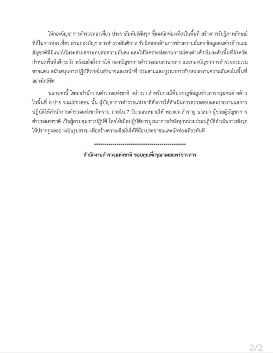 นอกจากนี้ โฆษกสำนักงานตำรวจแห่งชาติ กล่าวว่า สำหรับกรณีที่ปรากฏข้อมูลข่าวสารกลุ่มคนต่างด้าวในพื้นที่ อ.ปาย จ.แม่ฮ่องสอน นั้น ผู้บัญชาการตำรวจแห่งชาติสั่งการให้ดำเนินการตรวจสอบและรายงานผลการปฏิบัติให้สำนักงานตำรวจแห่งชาติทราบ ภายใน 7 วัน มอบหมายให้ พล.ต.ท.สำราญ นวลมา ผู้ช่วยผู้บัญชาการตำรวจแห่งชาติ เป็นผู้ควบคุมการปฏิบัติ โดยให้เปิดปฏิบัติการบูรณาการกำลังทุกหน่วยร่วมปฏิบัติดำเนินการเชิงรุกให้