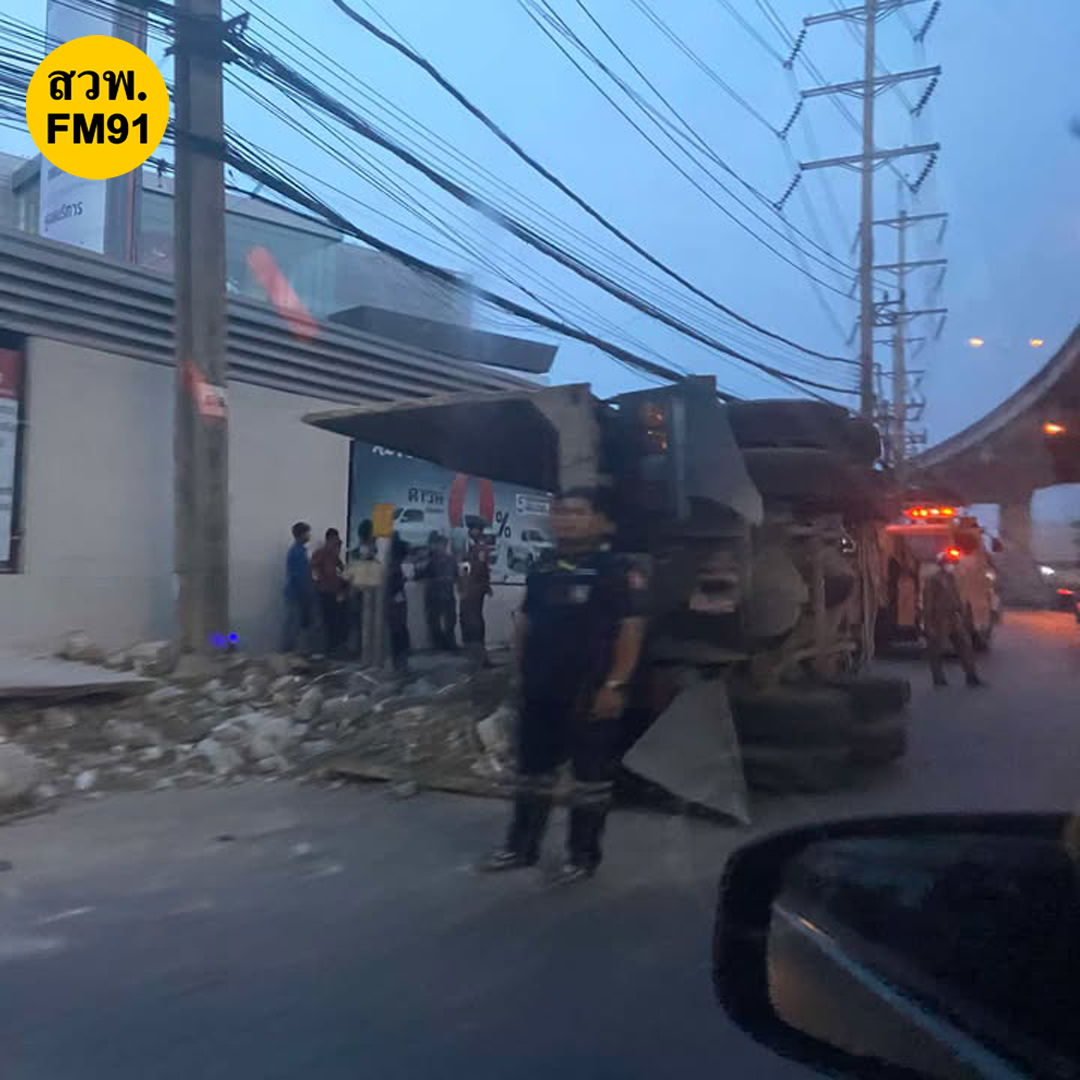 ถ.สุวินทวงศ์ ขาออก บริเวณแยกการไฟฟ้า มีนบุรี หน้าศูนย์รถโตโยต้า รถบรรทุกพ่วงเบรกแตก ทำให้เสียหลักพลิกตะแคง ส่งผลกระทบติดต่อเนื่อง รามคำแหง และร่มเกล้า
