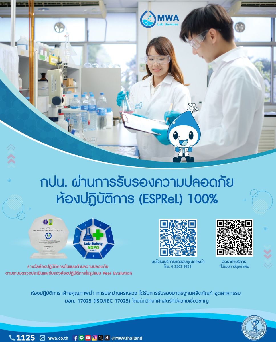 กปน. ยกระดับมาตรฐานความปลอดภัยของห้องปฏิบัติการตามเกณฑ์ ESPReL สร้างความเชื่อมั่นให้ผู้ใช้บริการทดสอบตัวอย่างน้ำได้ผลคุณภาพน้ำรวดเร็ว ถูกต้อง แม่นยำ