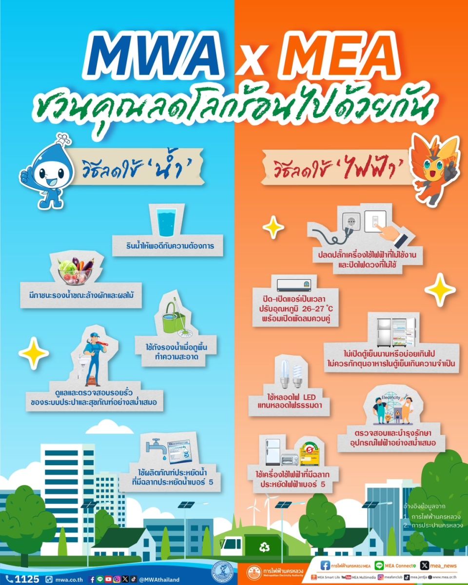 MWA หรือ การประปานครหลวง ร่วมกับ MEA หรือ การไฟฟ้านครหลวง ในฐานะหน่วยงานรัฐวิสาหกิจสังกัดกระทรวงมหาดไทย มีหน้าที่ดูแลระบบความมั่นคงระบบประปา และไฟฟ้า ในพื้นที่กรุงเทพมหานคร นนทบุรี และสมุทรปราการ ชวนคุณลดโลกร้อนไปด้วยกัน