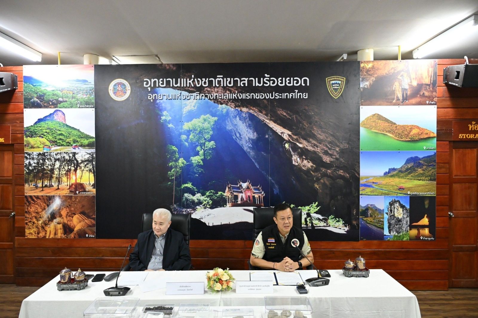 วันที่ 24 ก.พ.68 นายชิดชนก สุขมงคล รองอธิบดีกรมอุทยานแห่งชาติ สัตว์ป่า และพันธุ์พืช พร้อมด้วยนายพนมบุตร จันทรโชติ อธิบดีกรมศิลปากร ร่วมแถลงข่าวการค้นพบโครงกระดูกมนุษย์ยุคน้ำแข็ง (สมัยไพลสโตซีน) และภาพเขียนสีโบราณที่แหล่งโบราณคดีถ้ำดินในพื้นที่อุทยานแห่งชาติเขาสามร้อยยอด บ้านพุใหญ่ อ.สามร้อยยอด จ.ประจวบคีรีขันธ์ ที่ศูนย์บริการนักท่องเที่ยวเขาแดง อุทยานแห่งชาติเขาสามร้อยยอด อ.สามร้อยยอด จ.ประจวบคีรีขันธ์