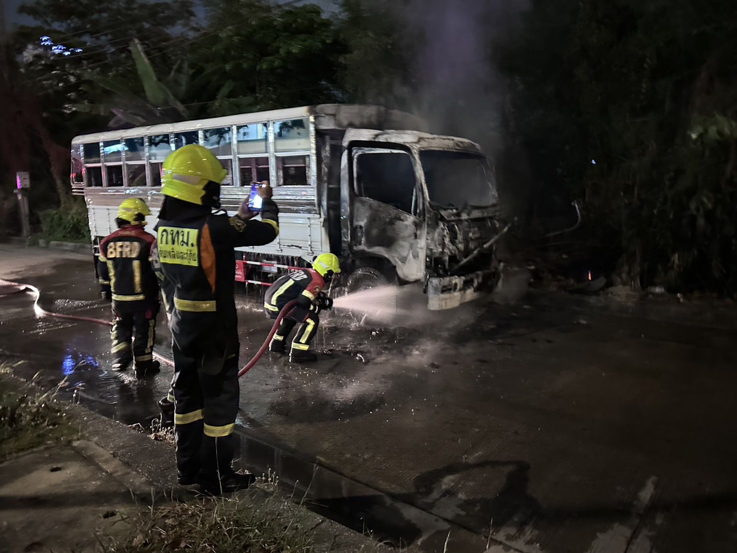 ไฟไหม้รถ 6 ล้อ ใกล้แยกพระราม 9 เจ้าหน้าที่ใช้น้ำทำการดับเพลิงสงบ เสียหายเกือบทั้งคัน
