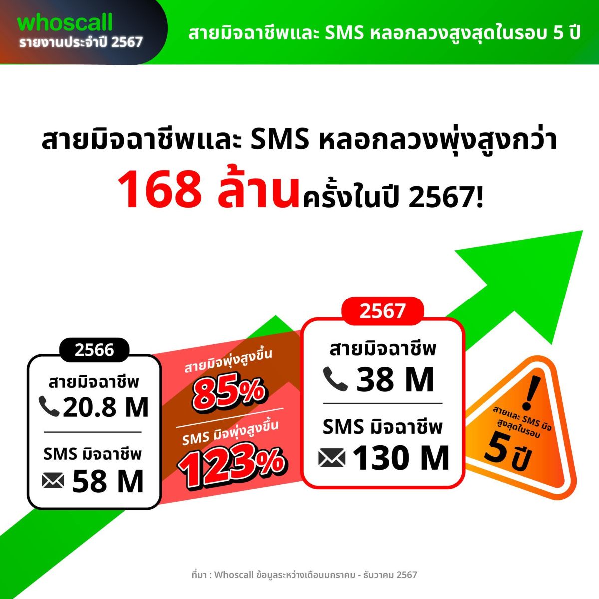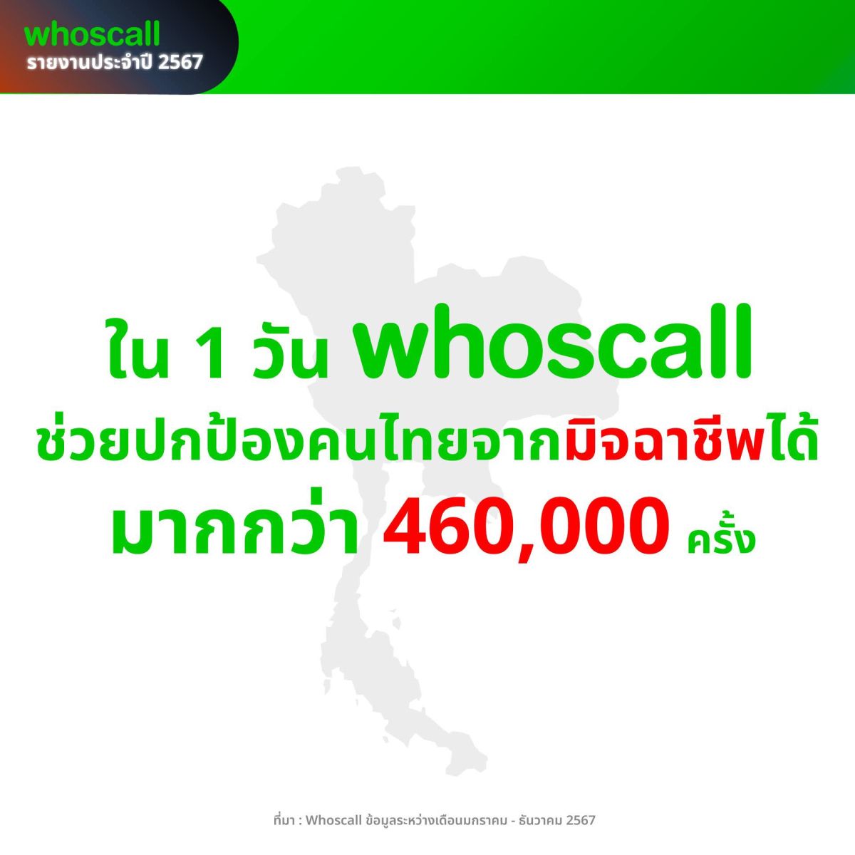 โดยในปี 2567 Whoscall สามารถระบุสายโทรเข้าและข้อความ SMS จากการหลอกลวงได้มากกว่า 168 ล้านครั้ง สูงสุดในรอบ 5 ปี สูงขึ้นจากปี 2566 ถึง 112% ที่ระบุได้ 79 ล้านครั้ง เฉลี่ยแล้ว สามารถระบุเบอร์เฉพาะมิจฉาชีพได้ 460,000 ครั้งต่อวัน