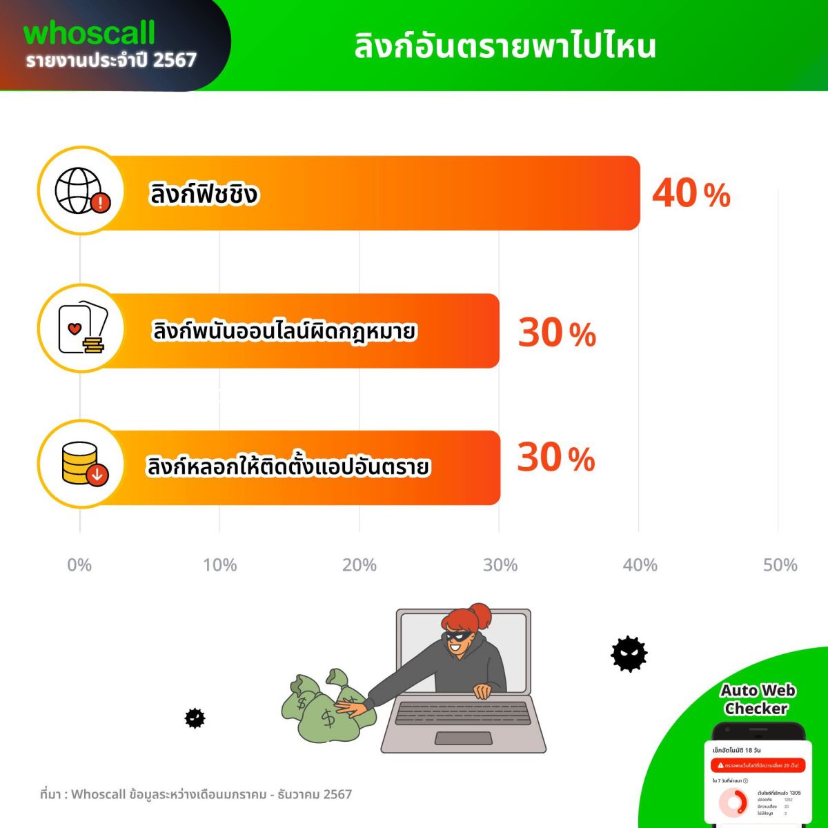 25 กุมภาพันธ์ 2568 บริษัท โกโกลุก ประเทศไทย ผู้ให้บริการแอปพลิเคชันป้องกันมิจฉาชีพ “Whoscall” เปิดรายงานประจำปี 2567 เกี่ยวกับสถานการณ์กลโกงมิจฉาชีพในไทยตลอดปีที่ผ่านมา จากการสำรวจทั้งสายโทรศัพท์ ข้อความ SMS ลิงก์ และฟีเจอร์ตรวจสอบข้อมูลรั่วไหลของ Whoscall