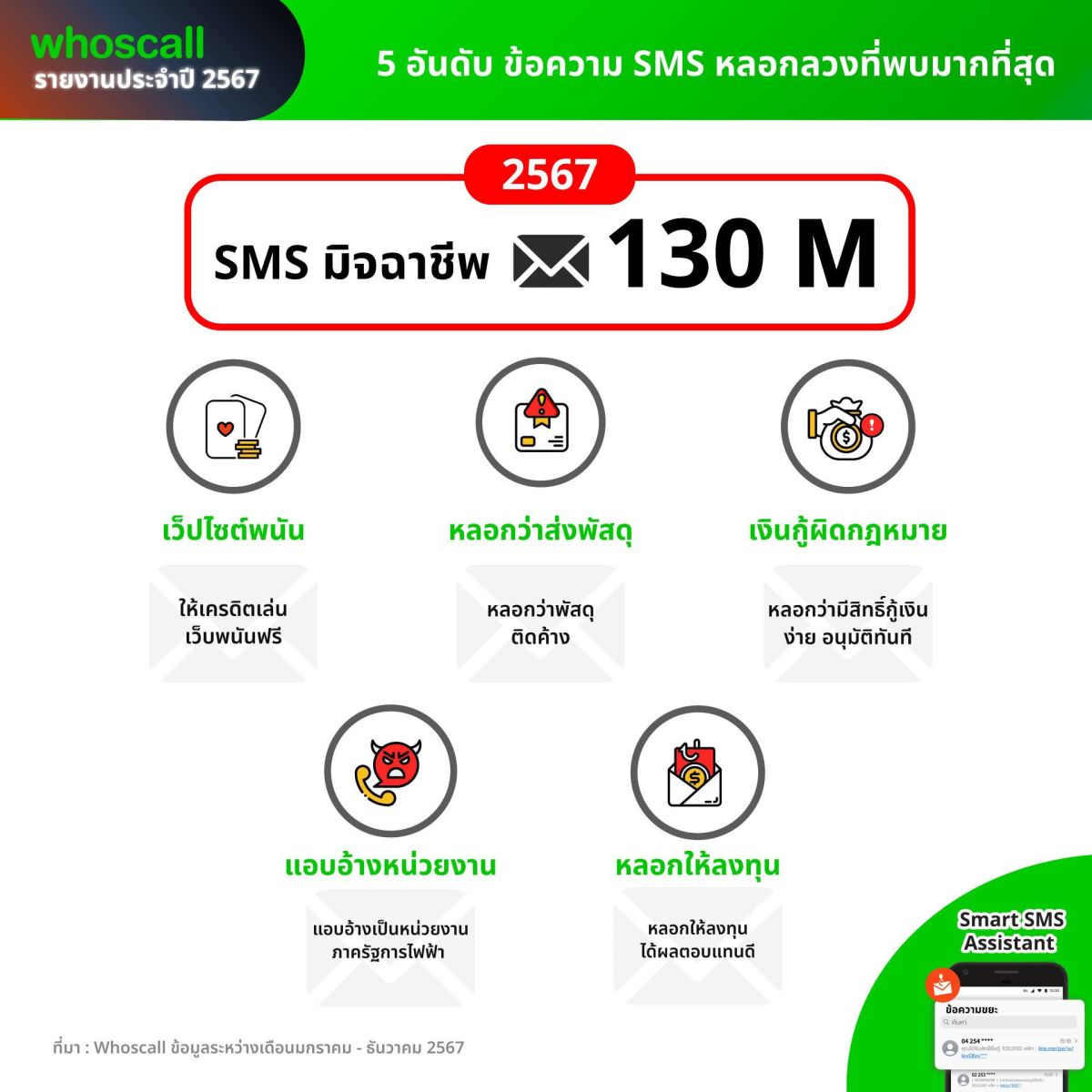 ในปี 2566 Whoscall สามารถตรวจพบสายมิจฉาชีพได้ 20.8 ล้านครั้ง SMS มิจฉาชีพ 58 ล้านครั้ง ขณะที่ในปี 2567 สามารถตรวจพบสายมิจฉาชีพได้ 38 ล้านครั้ง เพิ่มขึ้น 85% และตรวจพบ SMS มิจฉาชีพ 130 ล้านครั้ง เพิ่มขึ้น 123%