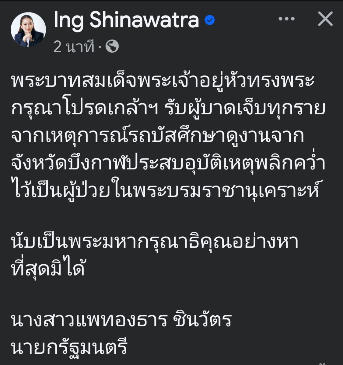 ขณะที่ นางสาวแพทองธาร ชินวัตร นายกรัฐมนตรี ได้โพสต์ เฟซบุ๊กระบุรายละเอียดว่า "พระบาทสมเด็จพระเจ้าอยู่หัวทรงพระกรุณาโปรดเกล้าฯ รับผู้บาดเจ็บทุกราย จากเหตุการณ์รถบัสศึกษาดูงานจากจังหวัดบึงกาฬประสบอุบัติเหตุพลิกคว่ำ ไว้เป็นผู้ป่วยในพระบรมราชานุเคราะห์ นับเป็นพระมหากรุณาธิคุณอย่างหาที่สุดมิได้