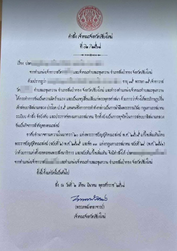 จึงมีคำสั่งให้ ปลดพระครู จากตำแหน่งเจ้าอาวาสวัด….และตำแหน่งเจ้าคณะตำบล อำเภอสันป่าตอง จังหวัดเชียงใหม่ ตั้งแต่บัดนี้เป็นต้นไป