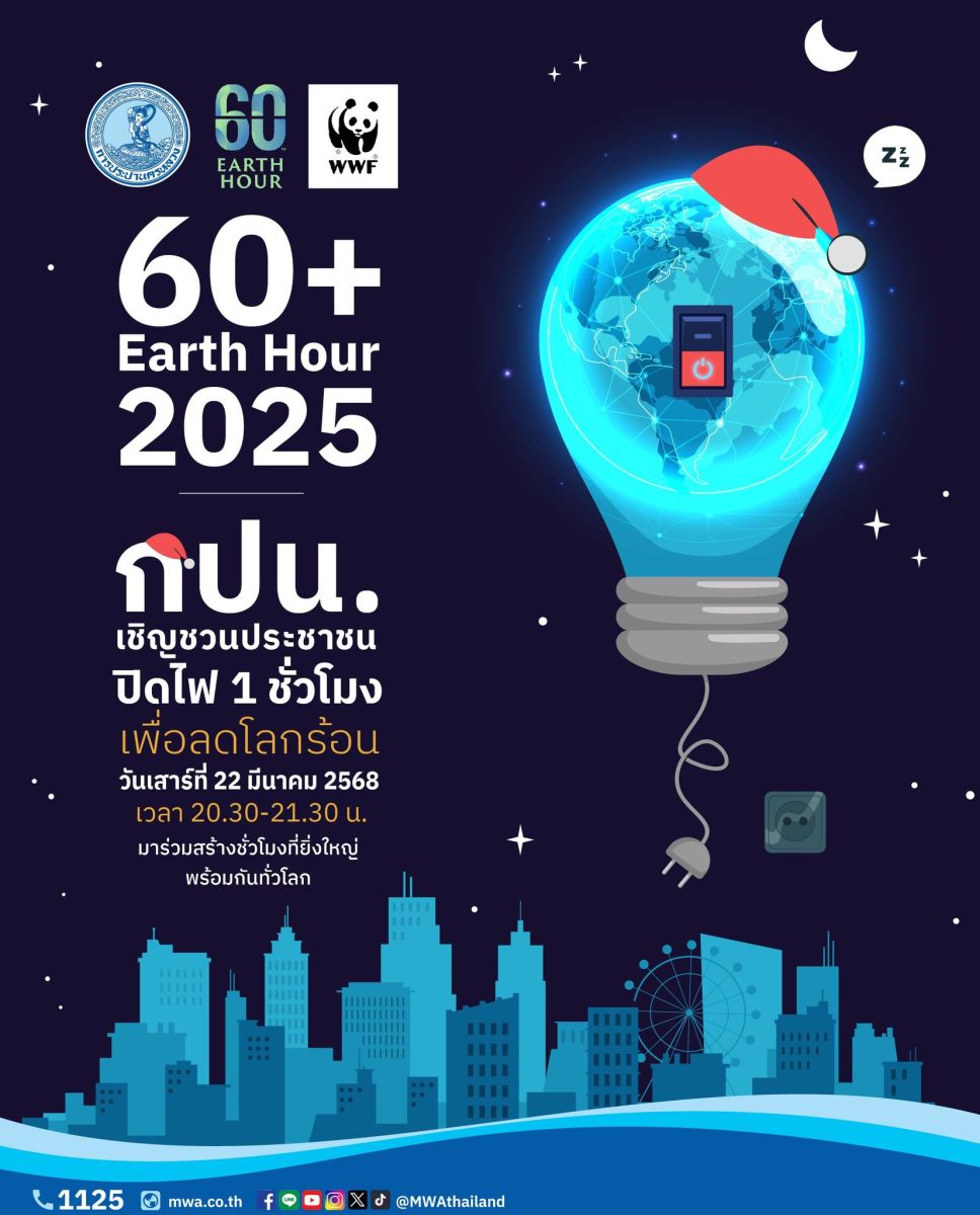 การประปานครหลวง (กปน.) ขอเชิญชวนประชาชนร่วมกิจกรรม 60+ Earth Hour วันเสาร์ที่ 22 มีนาคม 2568 เวลา 20.30 - 21.30 น. มาร่วมกันทำให้โลกได้พักด้วยการ “ปิดไฟ 1 ชั่วโมง ลดโลกร้อน” เพื่อร่วมเป็นส่วนหนึ่งในกิจกรรม 60+ Earth Hour ที่จัดขึ้นทั่วโลก