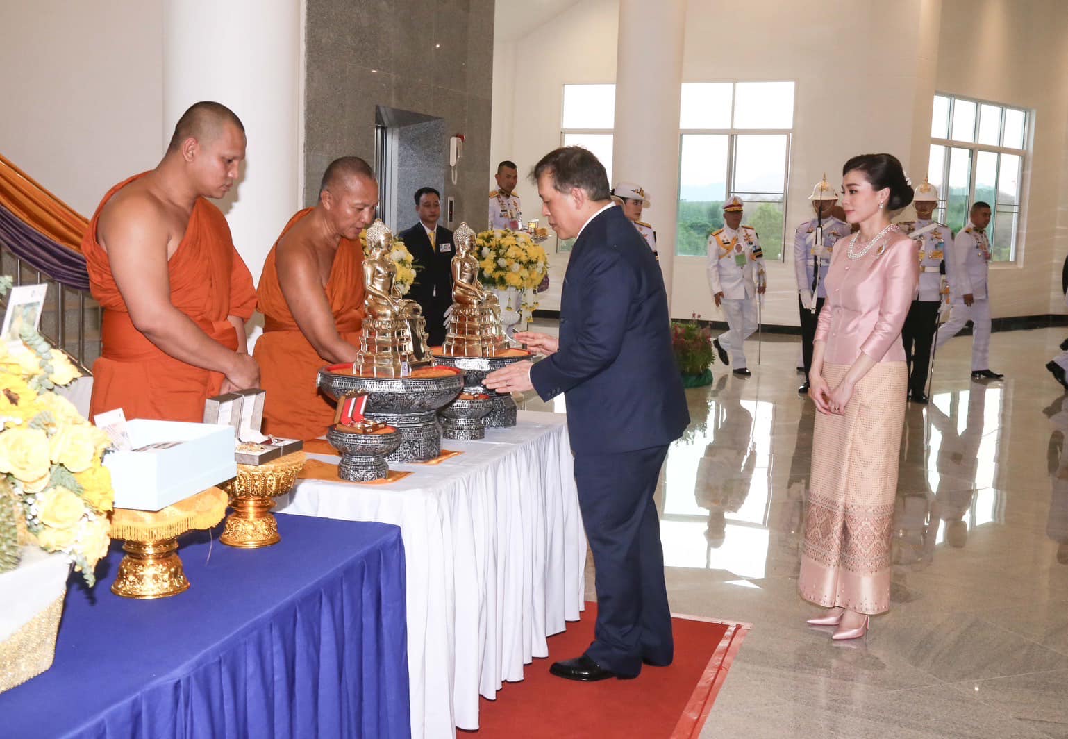 จากนั้น เสด็จออกจากพลับพลาพิธี ทรงพระสุหร่าย ทรงเจิมผ้าทิพย์อักษรพระปรมาภิไธย ภ.ป.ร. พระสงฆ์เจริญชัยมงคลคาถา ชาวพนักงานลั่นฆ้องชัย ประโคมสังข์ แตร ดุริยางค์ ทรงวางพวงมาลัย ทรงจุดธูปเทียนเครื่องนมัสการท้ายที่นั่งบูชาพระสมเด็จองค์ปฐม “พระพุทธเมตตา” ทรงกราบ แล้วเสด็จเข้าพลับพลาพิธีทรงประเคนจตุปัจจัยไทยธรรมถวายพระสงฆ์ ทรงหลั่งทักษิโณทก พระสงฆ์ถวายอนุโมทนา ถวายอดิเรก
