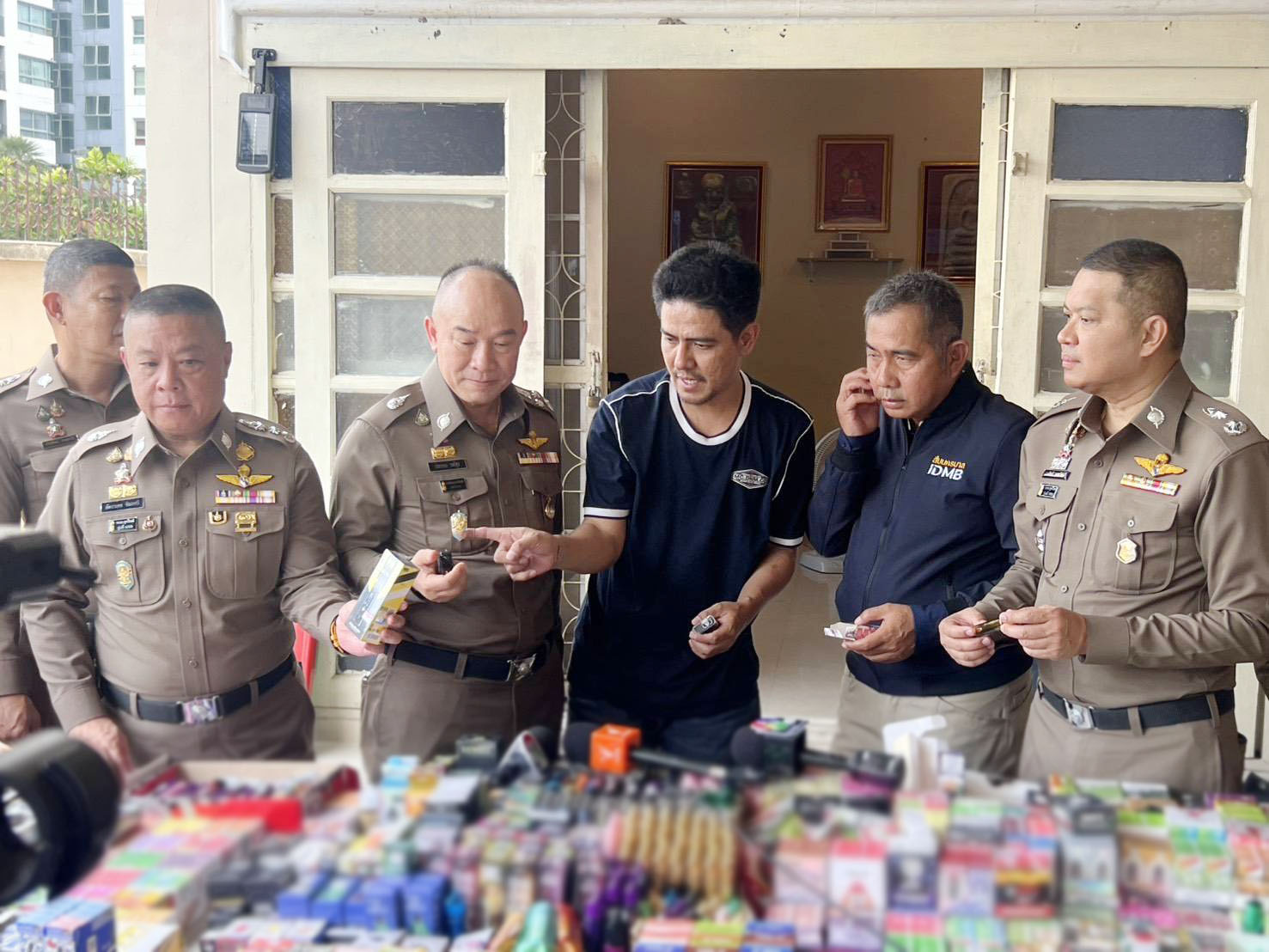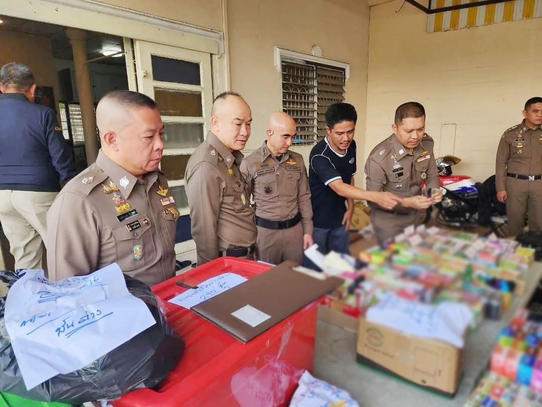 วันนี้(7 มี.ค.68) พลตำรวจเอก ประจวบ วงศ์สุข รองผู้บัญชาการตำรวจแห่งชาติ พร้อมด้วย พล.ต.ท. อัคราเดช พิมลศรี ผช.ผบ.ตร. พล.ต.ท.สยาม บุญสม ผบช.น. พล.ต.ต.นพศิลป์ พูลสวัสดิ์ รองผบช.น. และ พล.ต.ต.โชติวัฒน์ เหลืองวิลัย ผบก.สส.บช.น. ร่วมแถลงข่าวผลการเข้าตรวจค้น บ้านพัก 2 ชั้นแห่งหนึ่งในหมู่บ้านย่านไทรม้า จังหวัดนนทบุรี หลังได้รับรายงานจากสายข่าวว่า ดัดแปลงให้เป็นโกดังเก็บพักบุหรี่ไฟฟ้า แหล่งใหญ่