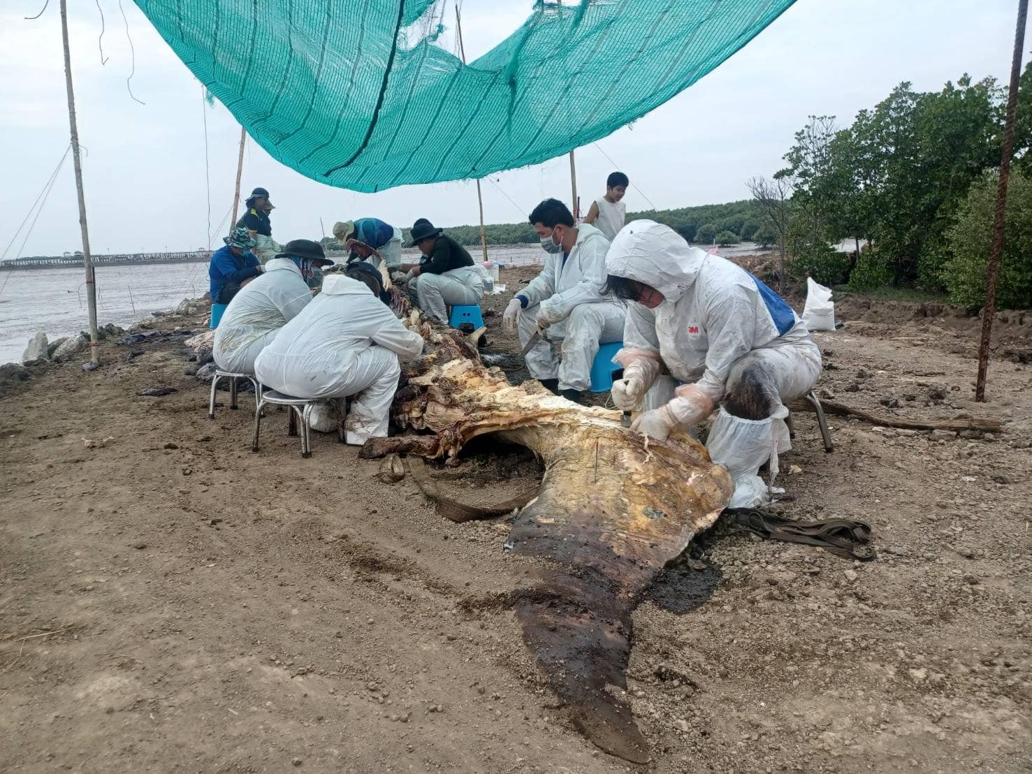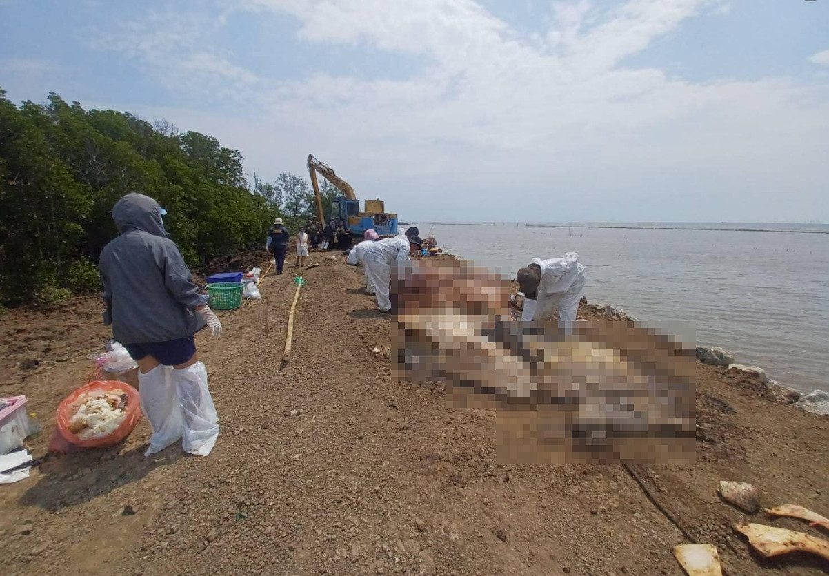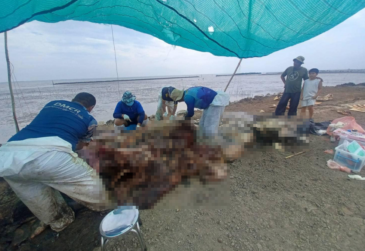 เมื่อวันที่ 8 มีนาคม 2568 ดร.ปิ่นสักก์ สุรัสวดี อธิบดีกรมทรัพยากรทางทะเลและชายฝั่ง (อทช.) กล่าวว่า กรมทรัพยากรทางทะเลและชายฝั่ง โดยศูนย์วิจัยทรัพยากรทางทะเลและชายฝั่งอ่าวไทยตอนบน (ศวทบ.) ร่วมกับเครือข่ายรักษ์อ่าวไทยตอนบน เจ้าหน้าที่ศูนย์วิจัยและพัฒนาประมงทะเลสมุทรปราการ กรมประมง องค์การพิพิธภัณฑ์วิทยาศาสตร์ และอาสาสมัคร ร่วมลงพื้นที่ชันสูตรซากวาฬบรูด้าที่ได้รับแจ้งเกยตื้น จากเพจที่นี่สมุทรปราการ เมื่อวันที่ 7 มีนาคม 2568 พบเป็นวาฬบรูด้า (Bryde's whale: Balaenoptera edeni) วัยรุ่น อายุไม่เกิน 3 ปี ตายมาเเล้วประมาณ 3 วัน เพศเมีย สภาพซากเน่า ผิวหนังหลุดลอก