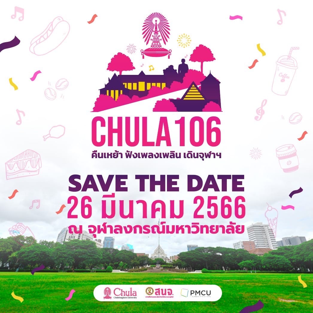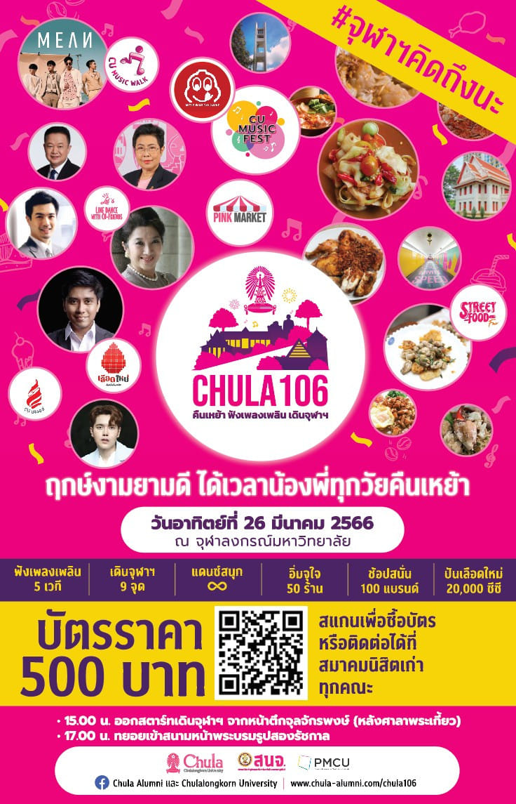 บัตรราคาเดียว 500 บาท ซื้อได้แล้วที่ chula-alumni.com/chula106 หรือ ติดต่อสมาคมนิสิตเก่าจุฬาฯ ได้ทุกคณะ สามารถติดตามรายละเอียดเพิ่มเติมได้ที่ Facebook Page: Chula Alumni และ Chulalongkorn University