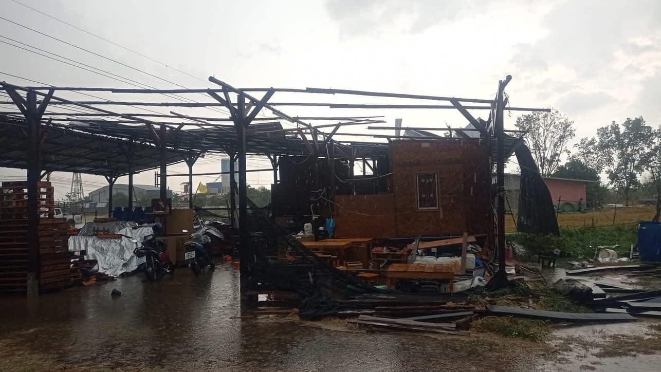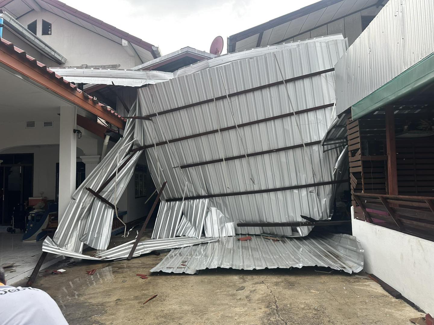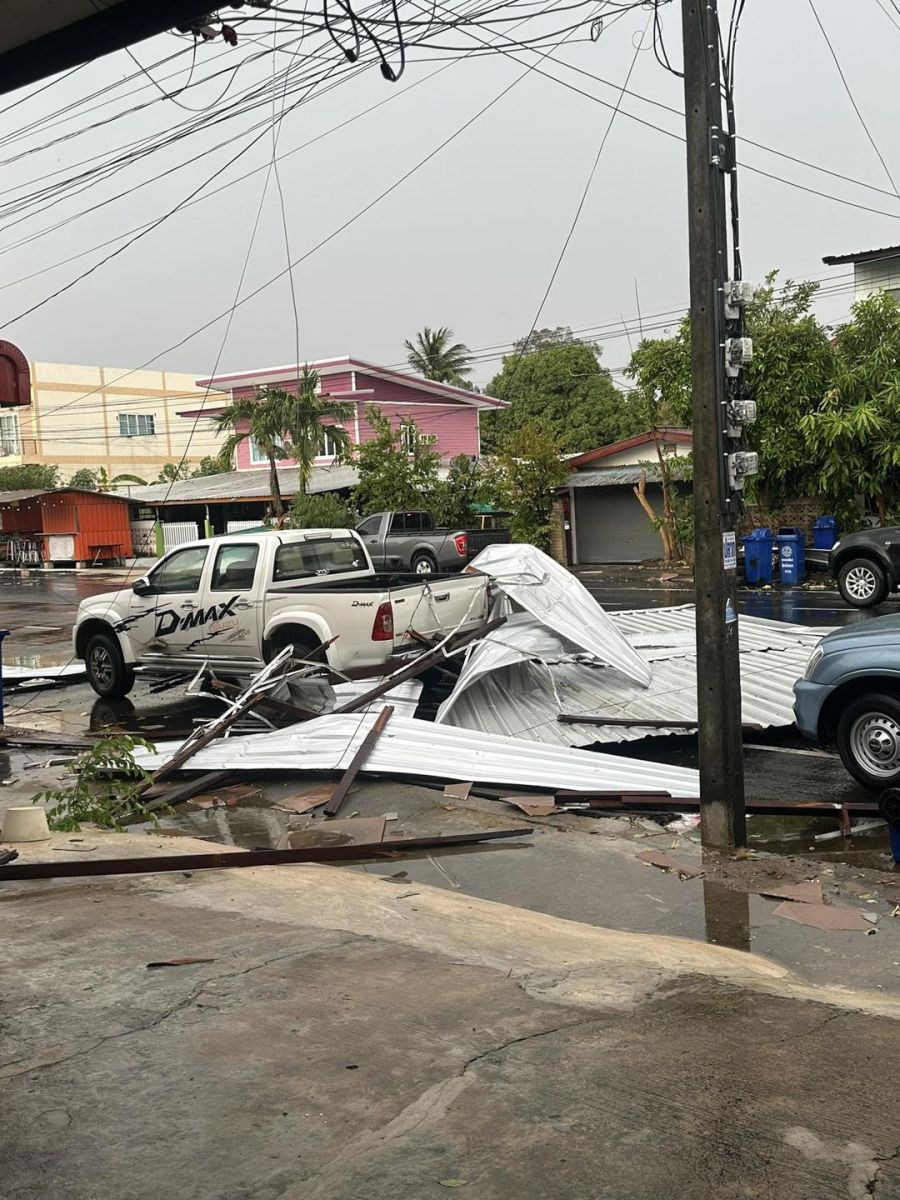 หลังคาบ้าน ถูกแรงลมพัดปลิวหายไปกับแรงลมกระจัดกระจายไปทั่วบริเวณและยังมีหลังคาสังกะสีบางส่วนพัดไปติดอยู่กับสายไฟฟ้าแรงสูงจนส่งผลให้กระแสไฟฟ้าดับเป็นบริเวณกว้าง เจ้าหน้าที่การไฟฟ้าต้องเร่งเข้าดำเนินการแก้ไขและนำเศษสังกะสีที่ปลิวไปติดสายไฟฟ้าแรงสูงออกอย่างเร่งด่วนเพื่อจะได้ปล่อยกระแสไฟฟ้าให้กับชาวบ้านได้มีไฟฟ้าใช้