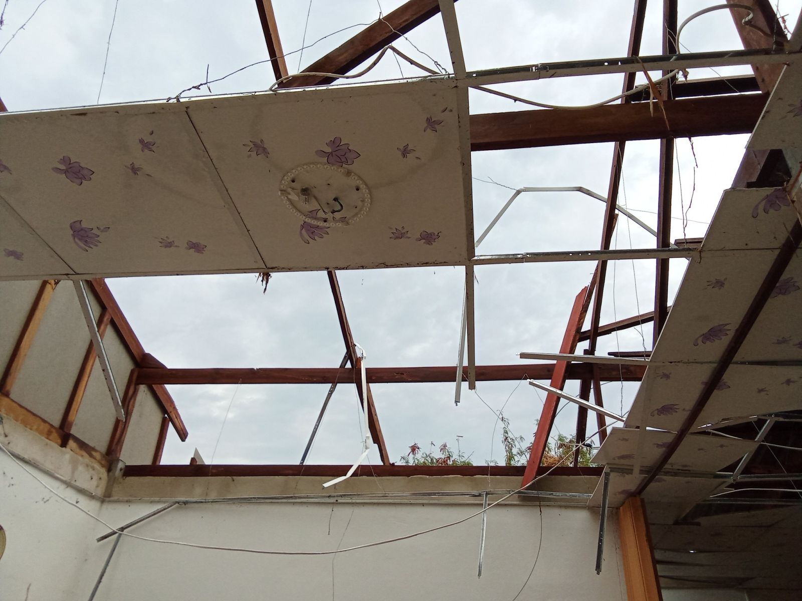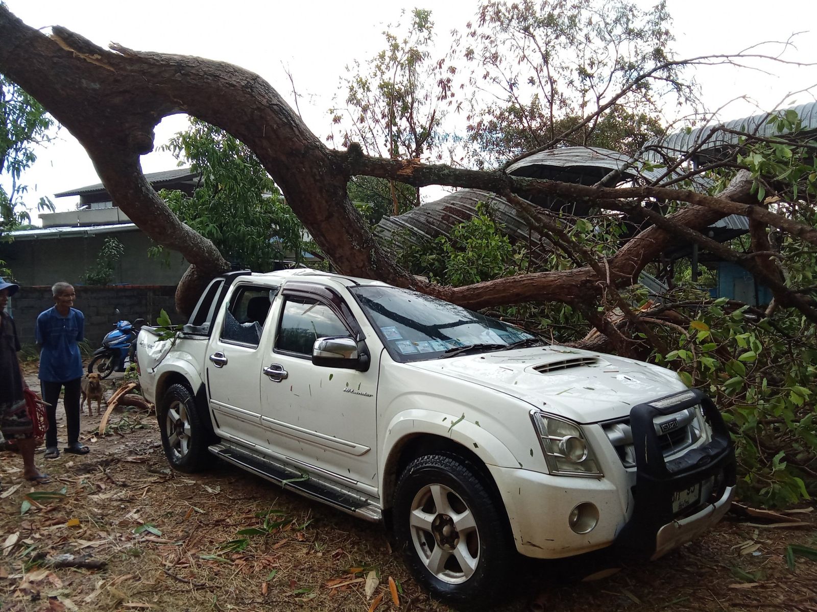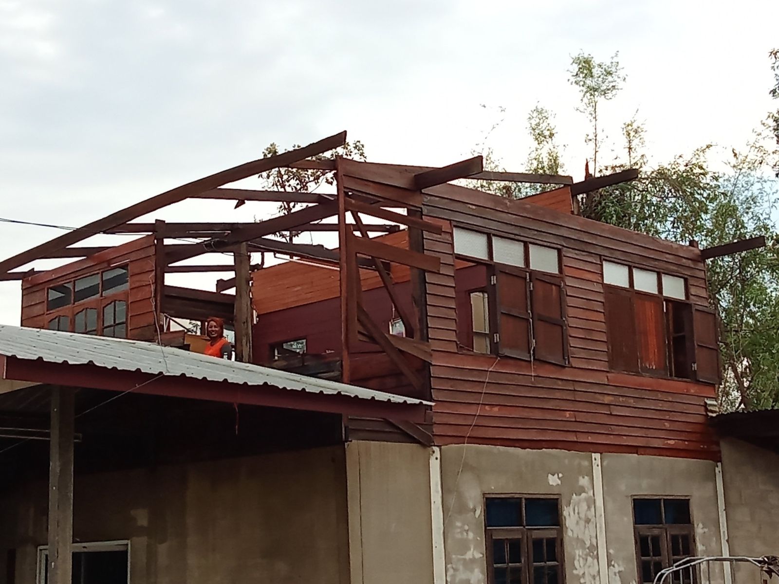 หลังคาบ้าน ถูกแรงลมพัดปลิวหายไปกับแรงลมกระจัดกระจายไปทั่วบริเวณและยังมีหลังคาสังกะสีบางส่วนพัดไปติดอยู่กับสายไฟฟ้าแรงสูงจนส่งผลให้กระแสไฟฟ้าดับเป็นบริเวณกว้าง เจ้าหน้าที่การไฟฟ้าต้องเร่งเข้าดำเนินการแก้ไขและนำเศษสังกะสีที่ปลิวไปติดสายไฟฟ้าแรงสูงออกอย่างเร่งด่วนเพื่อจะได้ปล่อยกระแสไฟฟ้าให้กับชาวบ้านได้มีไฟฟ้าใช้