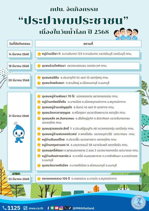 นายกิตติ ศรีพรหมมุนี ผู้อำนวยการฝ่ายสื่อสารองค์กร การประปานครหลวง (กปน.) เปิดเผยว่า กปน. จะจัดกิจกรรม “ประปาพบประชาชน” เนื่องในวันน้ำโลก ปี 2568 (World Water Day 2025) ในพื้นที่ให้บริการทั้ง 18 สาขา (รายละเอียดวันที่ และสถานที่จัดกิจกรรม ตามตารางในรูปภาพ)