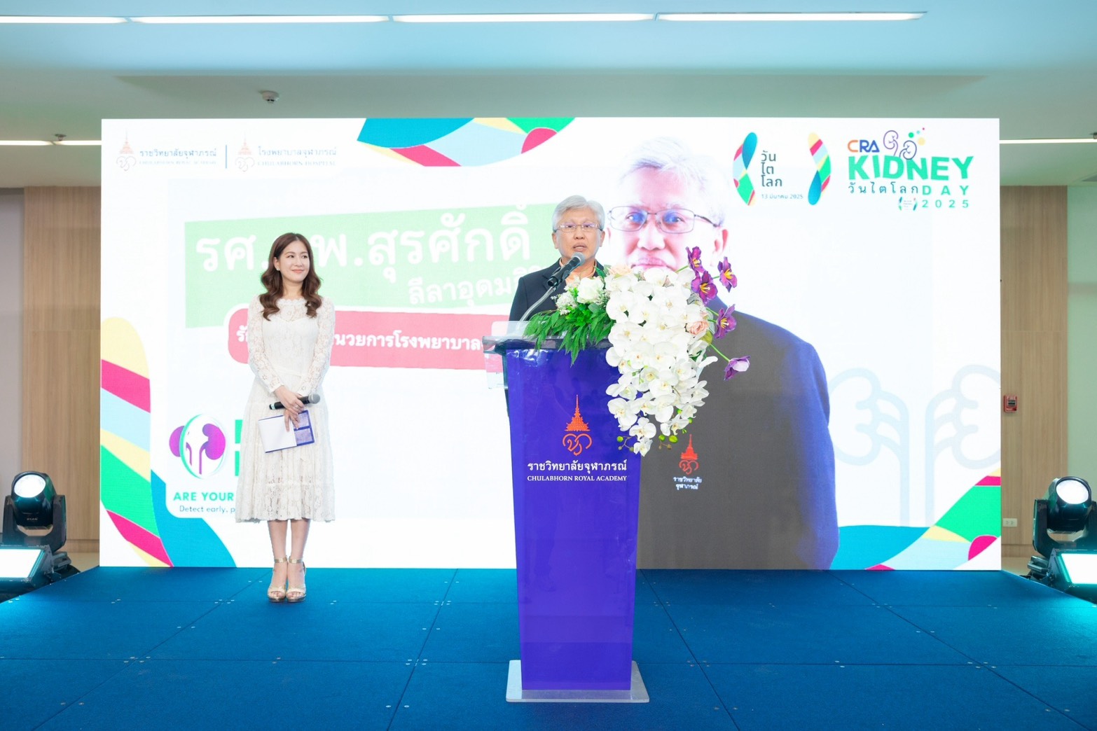 รองศาสตราจารย์ นายแพทย์สุรศักดิ์ ลีลาอุดมลิปิ รักษาการผู้อำนวยการโรงพยาบาลจุฬาภรณ์ เปิดเผยว่า “ ศูนย์โรคไต โรงพยาบาลจุฬาภรณ์ ราชวิทยาลัยจุฬาภรณ์ ในฐานะที่เป็นหน่วยให้บริการดูแลรักษาโรคไตแบบครบวงจร ได้ให้ความสำคัญของการจัดกิจกรรมวันไตโลก (World Kidney Day) พร้อมร่วมรณรงค์ส่งเสริมดูแลสุขภาพไตแก่ประชาชน ภายใต้แนวคิด “Are Your Kidneys OK? Detect Early, Protect Kidney Health” “หมั่นดูแลไต ใส่ใจคัดกรอง ป้องกันโรคไต” เพื่อให้บริการวิชาการด้านสุขภาพและร่วมดูแลรักษาสุขภาพในเชิงป้องกันโดยมุ่งหวังให้ประชาชนรู้ระดับความเสี่ยง หมั่นตรวจร่างกาย และลดพฤติกรรมเสี่ยงในชีวิตประจำวัน โดยมีเป้าหมายลดอัตราการตายจากโรคสำคัญ ทั้งยังสร้างการรับรู้การดูแลรักษาที่เหมาะสมและชะลอการเสื่อมของไต ตลอดจนให้ความรู้ความเข้าใจในการช่วยเหลือผู้ป่วยโรคไตด้วยการบริจาคอวัยวะ เพื่อสนับสนุนให้ระบบสุขภาพของประเทศมีความเข้มแข็ง ประชาชนไทยมีสุขภาพดี ”