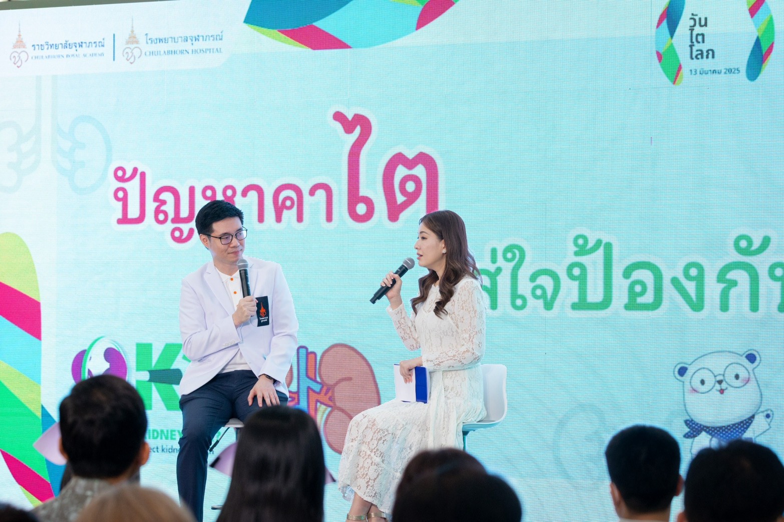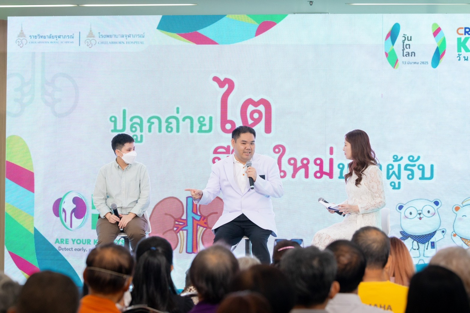 สำหรับกิจกรรมภายในงาน วันไตโลก ประจำปี 2568 “Are Your Kidneys OK? Detect Early, Protect Kidney Health” “หมั่นดูแลไต ใส่ใจคัดกรอง ป้องกันโรคไต” โรงพยาบาลจุฬาภรณ์ โดยศูนย์โรคไต ได้จัดให้มีการเสวนาให้ความรู้เกี่ยวกับโรคไต ในหัวข้อ ปัญหาคาไต ใส่ใจป้องกัน โดย นพ.ศุภณัฐ วรวิชชวงษ์ แพทย์เฉพาะทางด้านอายุรกรรมโรคไต รพ.จุฬาภรณ์ หัวข้อ ปลูกถ่ายไต ชีวิตใหม่ของผู้รับ โดย นพ.ปรัชญา พุมอุทัยวิรัตน์ แพทย์เฉพาะทางด้านอายุรกรรมโรคไต รพ.จุฬาภรณ์ ซึ่งมีแขกรับเชิญพิเศษ คุณชวัลกร ภู่เจนจบ คนไข้ผู้รับการปลูกถ่ายไตรายแรกของ รพ.จุฬาภรณ์ มาร่วมพูดคุยถึงการปลูกถ่ายไตในโอกาสนี้ด้วย และหัวข้อ ฟอกไต ต่อชีวิต ไตเขาไตเรา โดย นพ.ปิยพันธ์ ประพันธ์วัฒนะ แพทย์เฉพาะทางด้านอายุรกรรมโรคไต รพ.จุฬาภรณ์