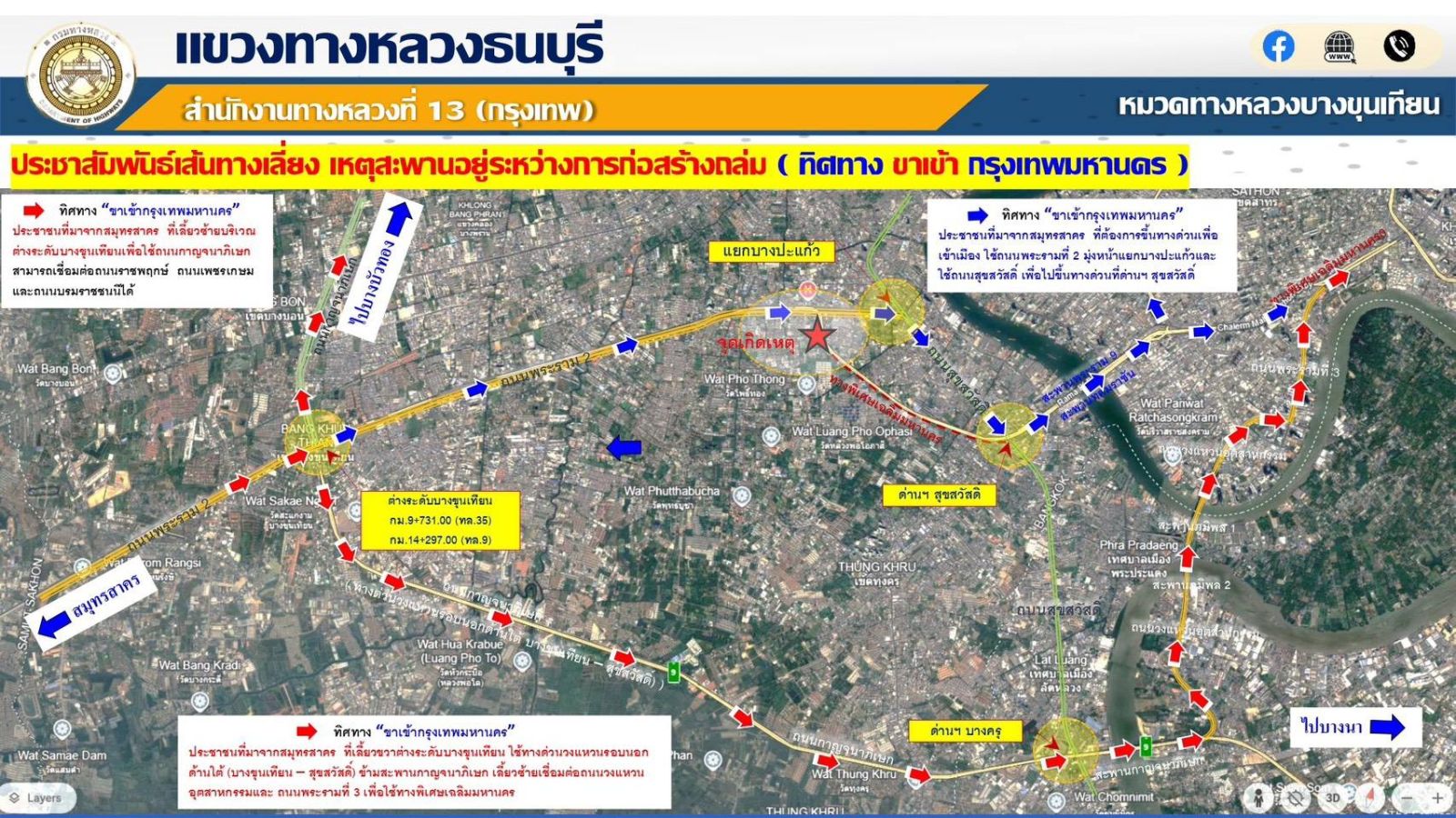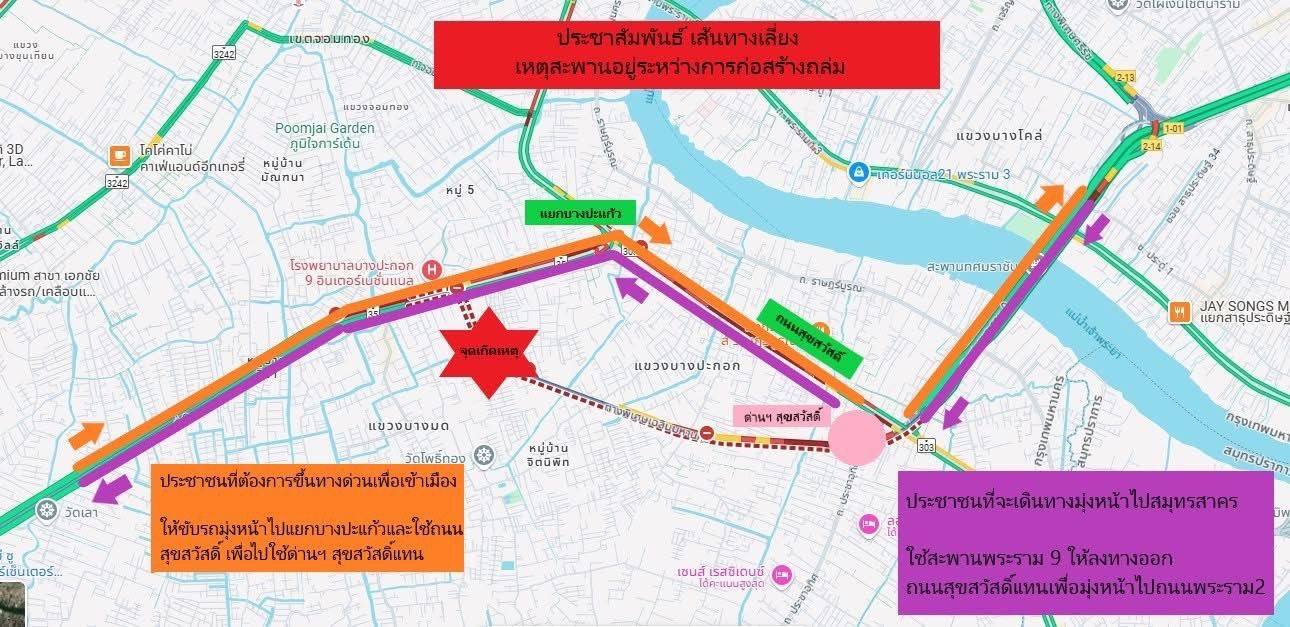 • ถนนพระราม 2 ขาเข้า แนะใช้เส้นทางถนนบางขุนเทียน - ชายทะเล จนถึงแยกบางบอน