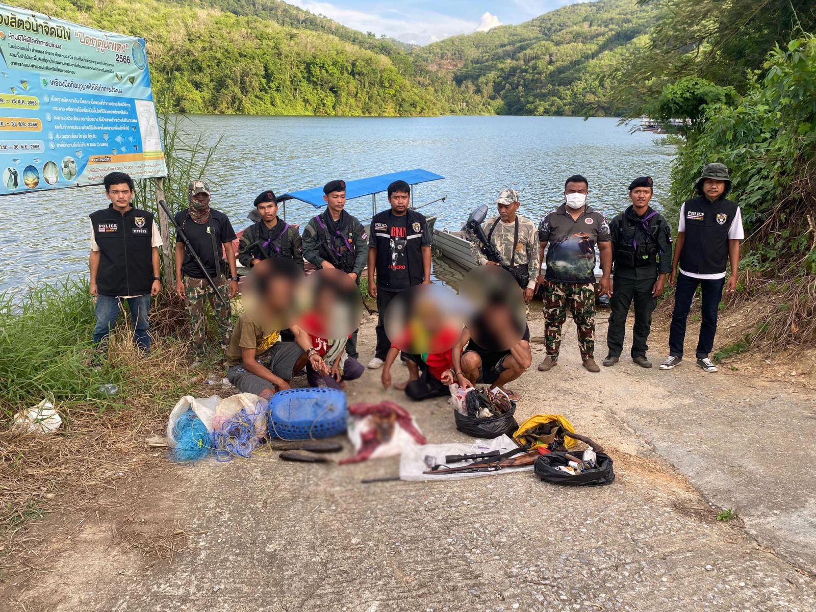 โดยเรือลำแรกมีนายพอ (นามสมมุติ) อายุ 30 ปี เป็นคนขับ นายชอ (นามสมมุติ) อายุ 37 ปี นั่งบนเรือ ลำที่2 มีนายวอ (นามสมมุติ) อายุ 46 ปี เป็นคนขับ นายจอ (นามสมมุติ) อายุ 54 ปี นั่งบนเรือ ซึ่งมีบางคน แสดงอาการตกใจ ท่าทางมีพิรุธ เมื่อเจ้าหน้าที่ส่งสัญญาณให้หยุดเรือ เจ้าหน้าที่จึงให้นำเรือเข้าจอดริมฝั่ง เพื่อขอตรวจค้น ก็พบปืนลูกกรดติดลำกล้อง 1 กระบอก กระสุนปืนขนาด .22 จำนวน 49 นัด เนื้อเก้งพร้อมหัว ใส่ไว้ในกระสอบปุ๋ย กบทูด ปลาพลวงหิน ใส่ไว้ในกระชังปลาสีน้ำเงิน อุปกรณ์จับสัตว์น้ำ อุปกรณ์เดินป่า มีทั้ง มีด ขวาน หัวไฟฉาย เปล ผ้ายางกันฝน และยังพบ ยาบ้าจำนวน 21 เม็ด ฝิ่นอีกจำนวนหนึ่ง