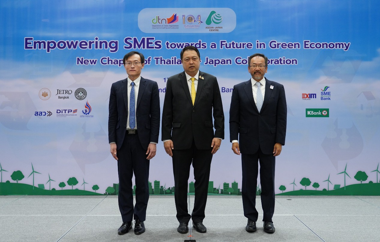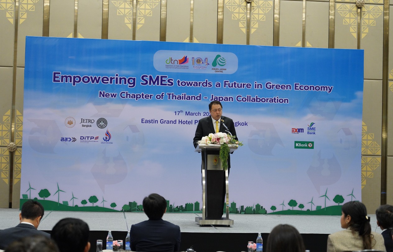 นายสุชาติ ชมกลิ่น รัฐมนตรีช่วยว่าการกระทรวงพาณิชย์ เปิดเผยว่า กระทรวงพาณิชย์ โดยกรมเจรจาการค้าระหว่างประเทศได้ร่วมมือกับศูนย์อาเซียน - ญี่ปุ่น หรือ ASEAN – Japan Centre จัดงานสัมมนา “พลิกเกม SMEs สู่อนาคตเศรษฐกิจสีเขียว: ก้าวบทใหม่ความร่วมมือไทย – ญี่ปุ่น” เมื่อวันที่ 17 มีนาคม 2568 ณ โรงแรมอีสติน แกรนด์ พญาไท กรุงเทพฯ โดยตนได้ร่วมเปิดงานสัมมนากับเอกอัครราชทูตญี่ปุ่นประจำประเทศไทย (นายโอตากะ มาซาโตะ) และผู้อำนวยการฝ่ายปฏิบัติการโครงการของศูนย์อาเซียน – ญี่ปุ่น (นายชัยรัตน์ เลียงขจรเกียรติ) ซึ่งเป็นอีกหนึ่งกิจกรรมความร่วมมือทางเศรษฐกิจระหว่างไทยกับญี่ปุ่นที่มุ่งสู่การเป็นเศรษฐกิจสีเขียวและการพัฒนาการค้าอย่างยั่งยืน โดยตั้งเป้าให้ผู้เข้าร่วมสัมมนาฯ เห็นถึงทิศทางและโอกาสของการปรับเปลี่ยนการดำเนินธุรกิจให้ตอบโจทย์การค้ายุคใหม่ที่ผู้บริโภคทั่วโลกให้ความสนใจและความสำคัญกับเรื่องสิ่งแวดล้อมและความยั่งยืนมากขึ้นซึ่งเป็นประเด็นท้าทายของภาคธุรกิจในระยะต่อไป ประกอบกับภาวะการแข่งขันทางธุรกิจที่มีแนวโน้มรุนแรงขึ้นทั่วโลก