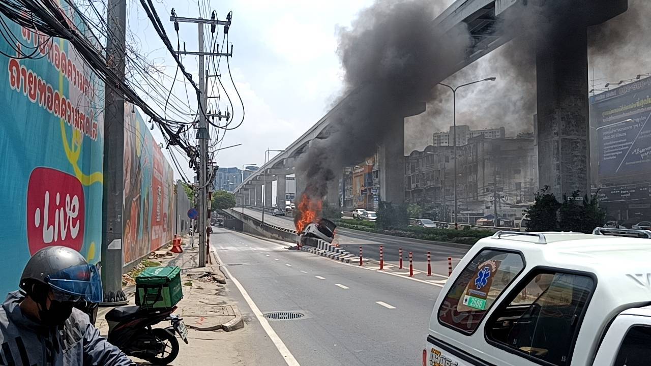 11.49 น. (18 มีนาคม 2568) ถนนรามอินทรา ขาออก เชิงสะพานข้ามแยก กม.8 รถแท็กซี่สีชมพู-ขาว พลิกตะแคง มีประชาชนกำลังให้การช่วยเหลือ กลุ่มพลเมืองดีสามารถช่วยเหลือผู้บาดเจ็บออกมาได้ทัน ก่อนจะเกิดกลุ่มควันและไฟลุกไหม้ การจราจรติดขัดมาก ในที่เกิดเหตุมีรถดับเพลิง และรถกู้ภัย กำลังดำเนินการ ที่เกิดเหตุพื้นที่ สน.คันนายาว