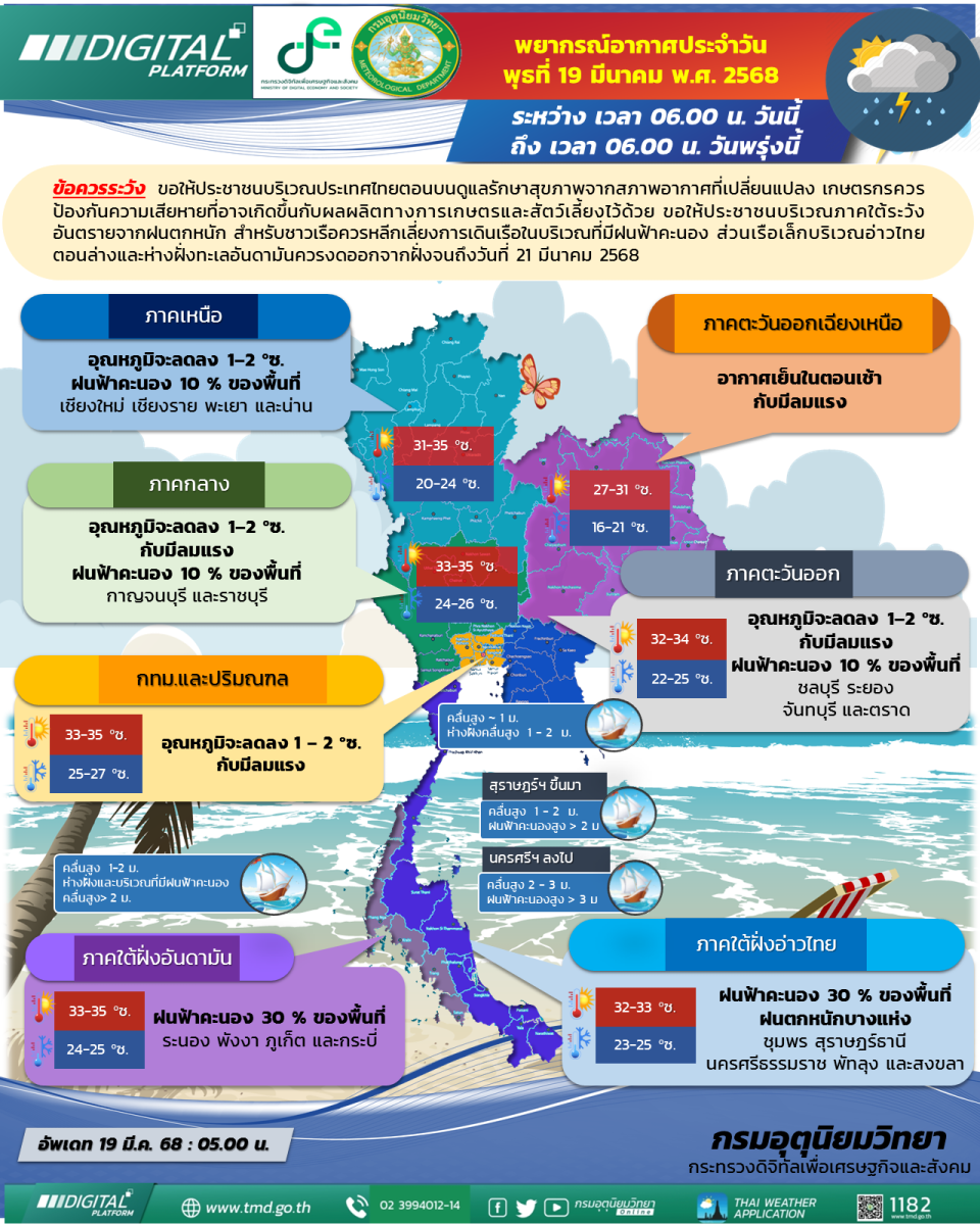 ส่วนเรือเล็กบริเวณอ่าวไทยตอนล่างและห่างฝั่งทะเลอันดามันควรงดออกจากฝั่งจนถึงวันที่ 21 มีนาคม 2568