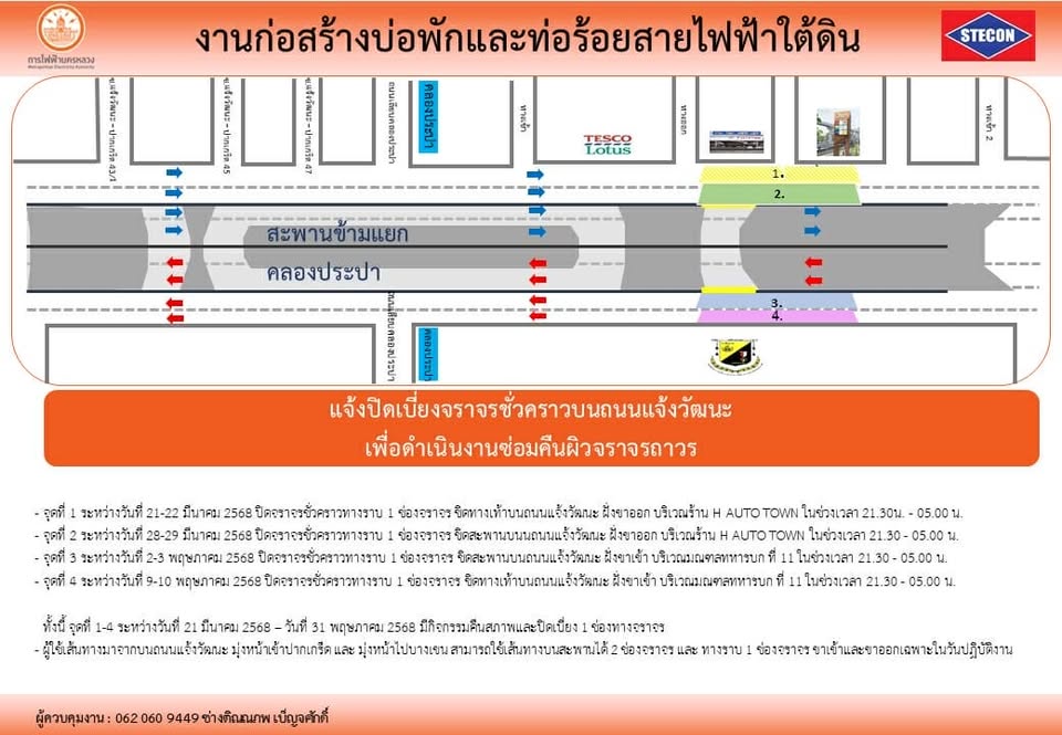 การไฟฟ้านครหลวงมีความจำเป็นต้องใช้ช่องทางจราจรในการดำเนินการก่อสร้างบ่อพักและท่อร้อยสายไฟฟ้าใต้ดิน บนถนนแจ้งวัฒนะ เพื่อดำเนินการคืนผิวจราจรถาวร ระหว่างวันที่ 21 มีนาคม 2568 - วันที่ 31 พฤษภาคม 2568 ตั้งแต่เวลา 21.30 - 05.00 น. จึงขอปรับรูปแบบการจราจร ดังนี้