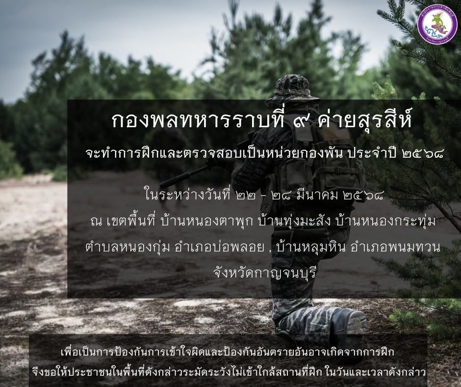 กองพลทหารราบที่ 9 ค่ายสุรสีห์ จะทำการฝึกและตรวจสอบเป็นหน่วยกองร้อย ประจำปี 2568 ระหว่างวันที่ 22 - 28 มีนาคม 2568 ณ พื้นที่ฝึกในเขตอำเภอบ่อพลอย และอำเภอพนมทวน จังหวัดกาญจนบุรี