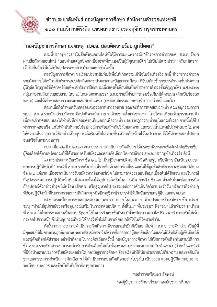 กองบัญชาการศึกษา ขอเรียนประชาสัมพันธ์เพื่อให้เกิดความเข้าใจในข้อเท็จจริง ดังนี้ ข้าราชการตำรวจ รายดังกล่าว ได้สมัครเข้าทำการสอบคัดเลือกตามประกาศกองบัญชาการศึกษา ที่รับสมัครข้าราชการตำรวจชั้นประทวน ผู้มีวุฒิปริญญาตรีนิติศาสตร์บัณฑิต เข้ารับการฝึกอบรมเพื่อแต่งตั้งเลื่อนชั้นเป็นข้าราชการตำรวจชั้นสัญญาบัตร พ.ศ.2567 กลุ่มสายงานสืบสวนสอบสวน (สบ.ด) โดยผลคะแนนของ ส.ต.อ.รายนี้ผ่านการสอบข้อเขียนได้คะแนน (คิดเป็นร้อยละ 60.6) และให้เข้าทดสอบความเหมาะสมกับตำแหน่ง (ทดสอบสมรรถภาพทางร่างกาย ว่ายน้ำและวิ่ง)
