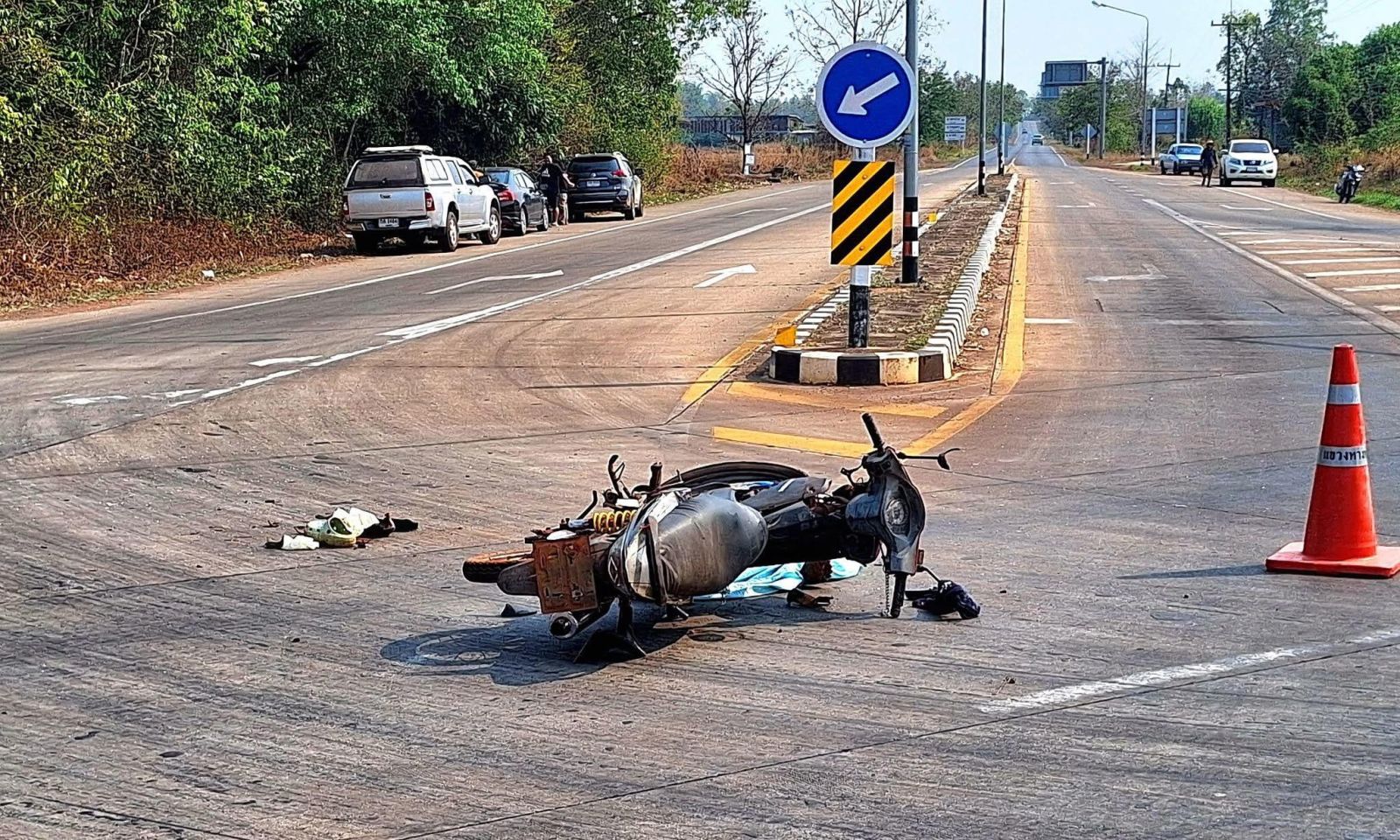 รถจักรยานยนต์ชนกับรถนั่งส่วนบุคคล เข้ากลางลำ กลางทาง 3 แยก ชายวัย 40 ปีเสียชีวิตในเวลาต่อมา จ.นครพนม