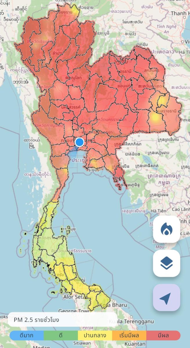 กระทรวง อว. โดย GISTDA เกาะติดสถานการณ์ฝุ่น PM 2.5 ด้วยข้อมูลจากดาวเทียมแบบรายชั่วโมงผ่านแอปพลิเคชัน “เช็คฝุ่น” รอบเวลา 08:00 น. ของวันที่ 24 มีนาคม 2568 พบว่าทุกเขตของกรุงเทพมหานคร มีค่าฝุ่นในระดับสีแดงส่งผลต่อสุขภาพและระบบทางเดินหายใจ