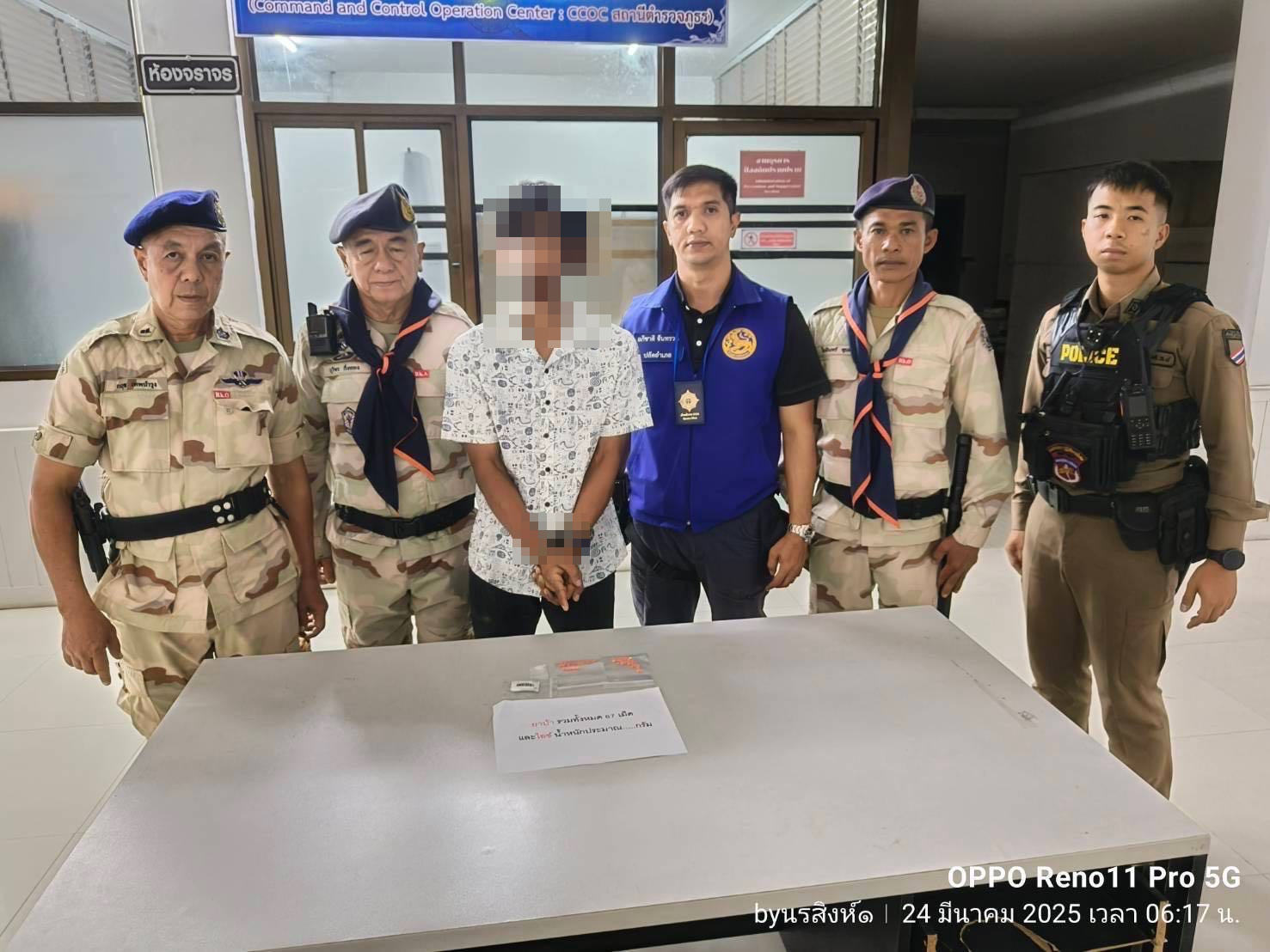 โดยทำการตรวจค้นตัว ชายไทย อายุ 28 ปี ซึ่งโดยสารมากับรถ เนื่องจากมีพิรุธน่าสงสัย ผลการตรวจค้นพบ ยาบ้า จำนวน 67 เม็ด และยาไอซ์ประมาณ 1 กรัม ซุกซ่อนในกระเป๋ากางเกง