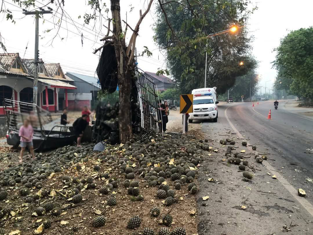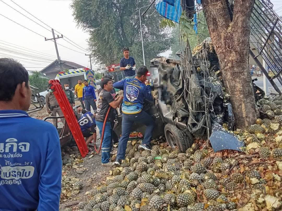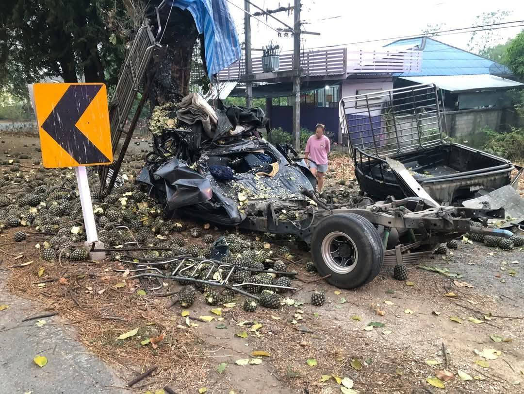 กระบะบรรทุกสับประรดเต็มคัน เสียหลักฟาดเข้าต้นไม้ข้างทาง สภาพรถพังยับ คนขับเจ็บหนัก กู้ภัยเร่งนำส่ง รพ.