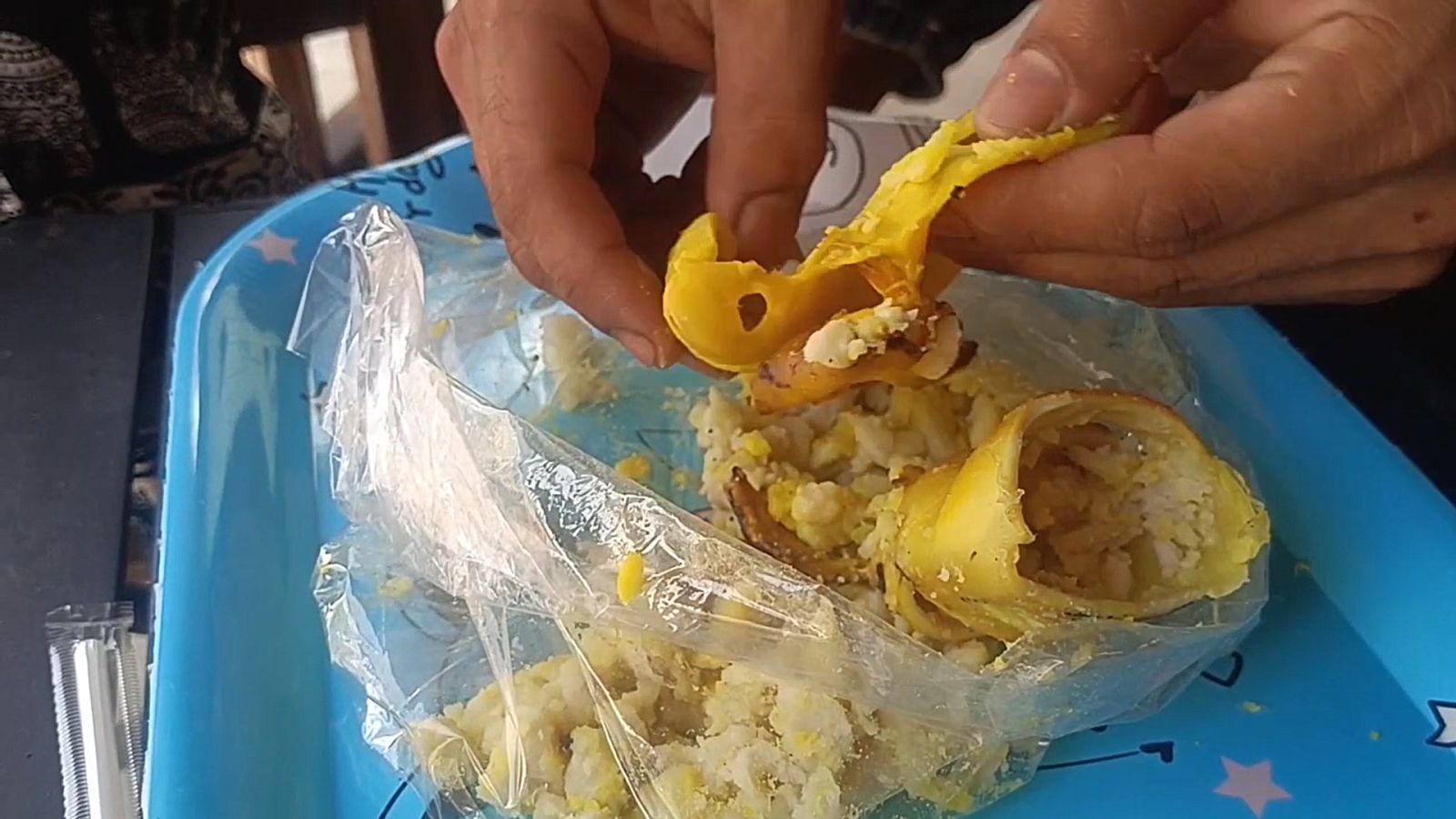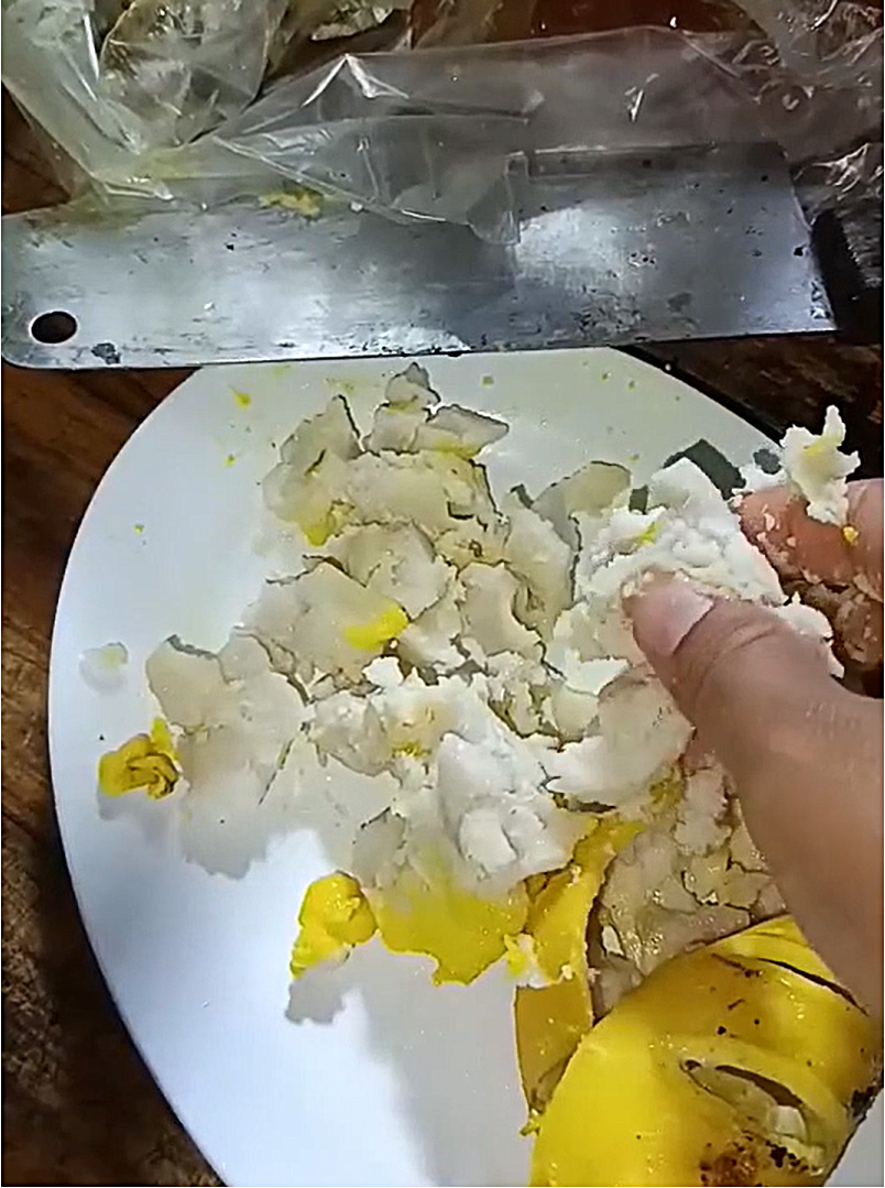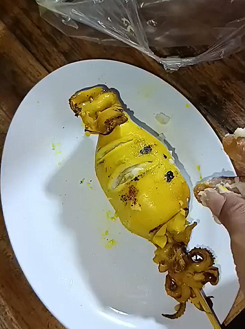 ขณะซื้อ ทั้งสองสังเกตเห็นปลาหมึกที่วางขายดูน่ารับประทานมาก เนื่องจากมีไข่หมึกโผล่ออกมาจากท้องชัดเจน แต่พอกลับถึงบ้านแล้วหั่นปลาหมึกออก กลับพบว่าข้างในตัวหมึกไม่มีไข่เต็มท้องอย่างที่คิดไว้ มีเพียงไข่หมึกเล็กน้อยเท่าปลายเล็บ ส่วนที่เหลือเป็นเนื้อสีขาวคล้ายแป้งที่ไม่ทราบชนิด อีกทั้ง เมื่อดมดู ก็พบว่า ไม่มีทั้งกลิ่นหรือรสชาติ มีเพียงความจืดสนิท ทั้งคู่จึงตั้งข้อสังเกตว่า หากแม่ค้ายัดไส้หมึกด้วยแป้ง ควรติดป้ายบอกให้ชัดเจน เพราะถ้าผู้บริโภคบางคนแพ้แป้ง อาจได้รับอันตรายได้