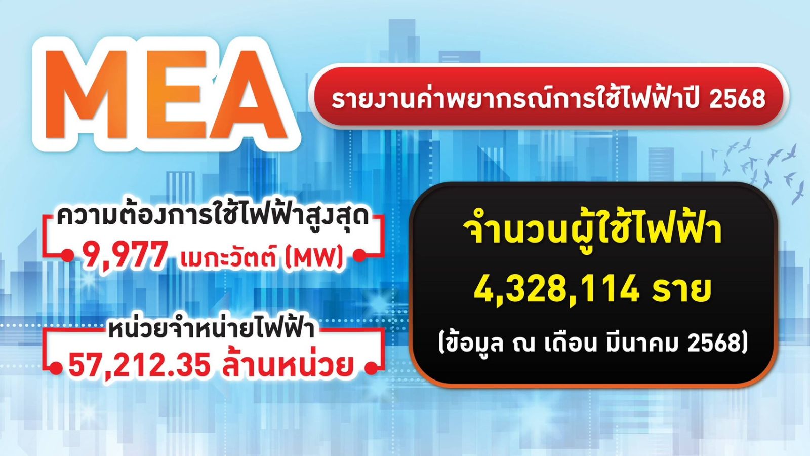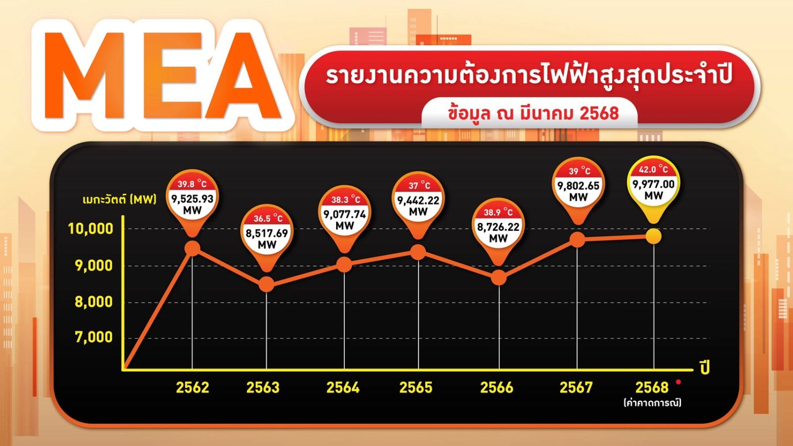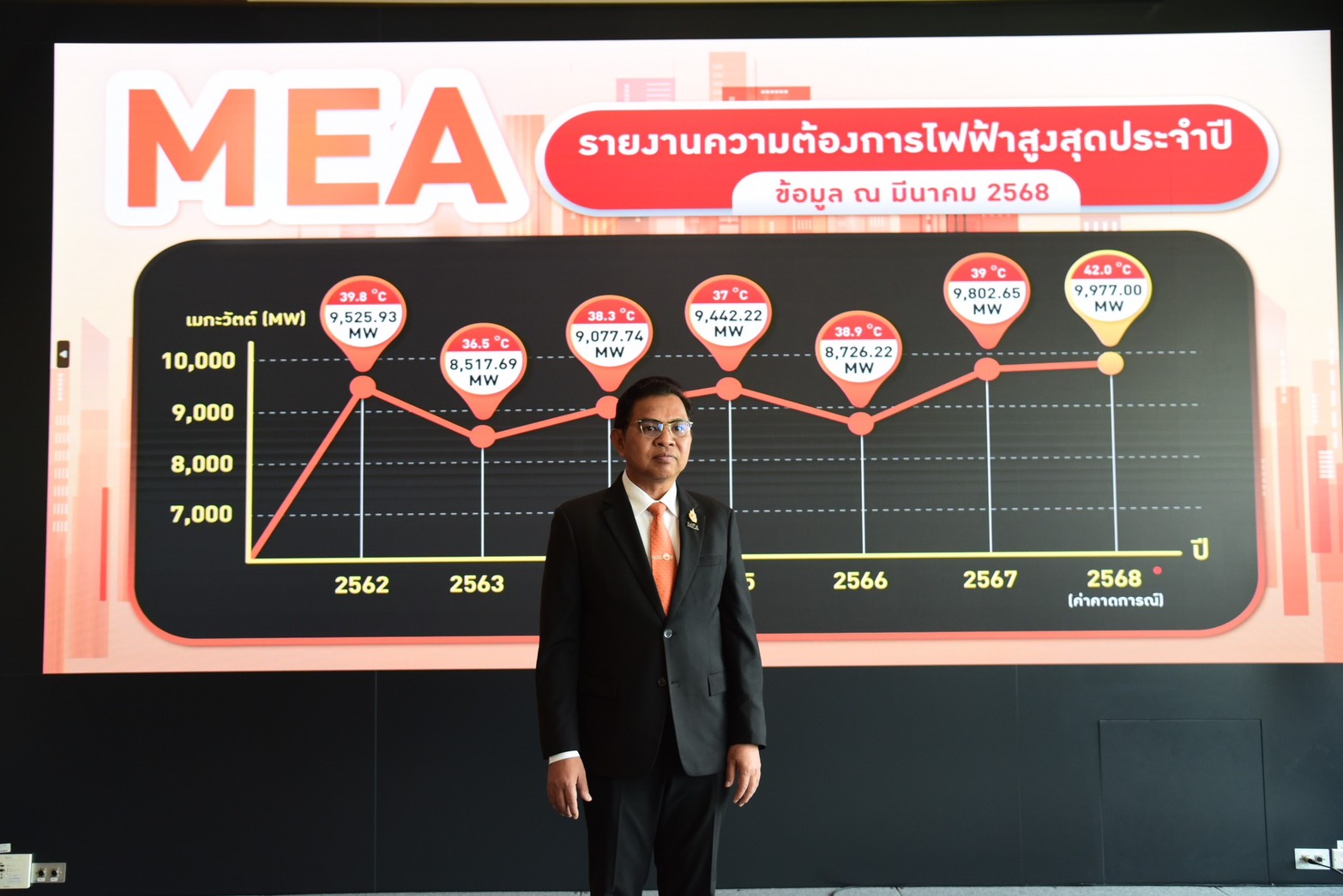 วันนี้ (26 มีนาคม 2568) นายวิลาศ เฉลยสัตย์ ผู้ว่าการ MEA หรือการไฟฟ้านครหลวง เปิดเผยสถิติการใช้ไฟฟ้าในพื้นที่ของ MEA หรือการไฟฟ้านครหลวง ซึ่งประกอบด้วย กรุงเทพมหานคร นนทบุรี และสมุทรปราการ ว่า ตามที่ในช่วงฤดูร้อนจะเป็นช่วงฤดูที่มีการใช้ไฟฟ้ามากที่สุดในรอบปีนั้น สำหรับปี 2568 จากจำนวนผู้ใช้ไฟฟ้าประมาณ 4.32 ล้านราย MEA คาดการณ์ค่าพีคในระบบจำหน่ายของ MEA ไว้ที่ 9,977 เมกะวัตต์ เพิ่มขึ้นจากค่าสูงสุดของปี 2567 เท่ากับ 174 เมกะวัตต์ หรือคิดเป็น 1.77% จากปี 2567 ที่ผ่านมา โดยคาดว่าจะเกิดขึ้นในช่วงปลายเดือนเมษายน ถึงช่วงต้นเดือนพฤษภาคม เนื่องจากเป็นช่วงที่มีการใช้ไฟฟ้าสูง ประกอบกับสภาพอากาศร้อนเป็นอย่างมาก ตามการคาดหมายลักษณะอากาศช่วงฤดูร้อนของประเทศไทยของกรมอุตุนิยมวิทยา โดยอุณหภูมิสูงที่สุดจะอยู่ที่ 42 องศาเซลเซียส (ทั้งนี้ MEA รายงานความต้องการพลังงานไฟฟ้าสูงสุดปี 2568 จากข้อมูล ณ ปัจจุบัน เกิดขึ้นเมื่อวันที่ 25 มีนาคม 2568 ที่ผ่านมา อุณหภูมิสูงสุด 36.6 องศาเซลเซียส เวลา 15.30 - 16.00 น. ที่ 8,758.63 เมกะวัตต์)