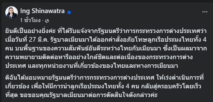 โดยข้อความระบุว่า “ยินดีเป็นอย่างยิ่งค่ะ ที่ได้รับแจ้งจากรัฐมนตรีว่าการกระทรวงการต่างประเทศว่า เมื่อวันที่ 27 มี.ค. รัฐบาลเมียนมาได้ออกคำสั่งอภัยโทษลูกเรือประมงไทยทั้ง 4 คน บนพื้นฐานของความสัมพันธ์อันดีระหว่างไทยกับเมียนมา ซึ่งเป็นผลมาจากความพยายามติดต่อหารืออย่างใกล้ชิดและต่อเนื่องของกระทรวงการต่างประเทศ และทุกหน่วยงานที่เกี่ยวข้องของไทยและทางการเมียนมา