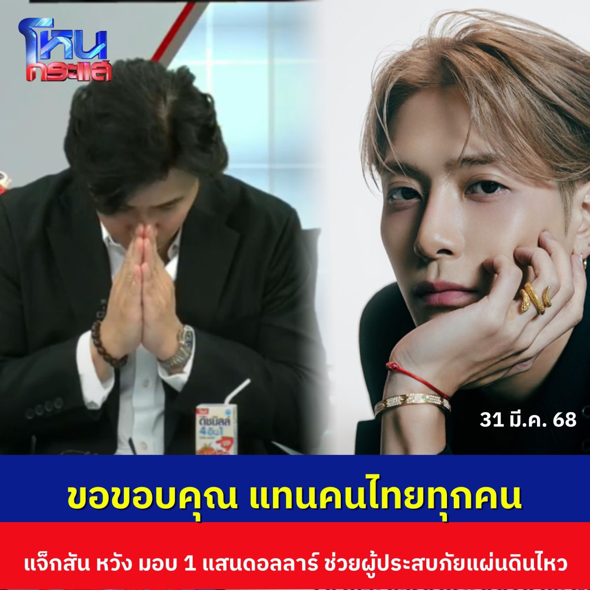 วันที่ 31 มีนาคม 2568 ในรายการ โหนกระแส “แจ็คสัน หวัง” ศิลปิน K-Pop ชื่อดังจากวง GOT7 ได้ติดต่อมายัง หนุ่ม กรรชัย เพื่อแสดงความห่วงใยต่อสถานการณ์แผ่นดินไหวที่เกิดขึ้นในเมียนมา ซึ่งส่งผลกระทบมาถึงประเทศไทย โดยเจ้าตัวขอร่วมช่วยเหลือผู้ประสบภัยด้วยการบริจาคเงินจำนวน 100,000 ดอลลาร์สหรัฐ (ราว 3.3 ล้านบาท) เพื่อบรรเทาความเดือดร้อนของผู้ได้รับผลกระทบจากภัยพิบัติครั้งนี้