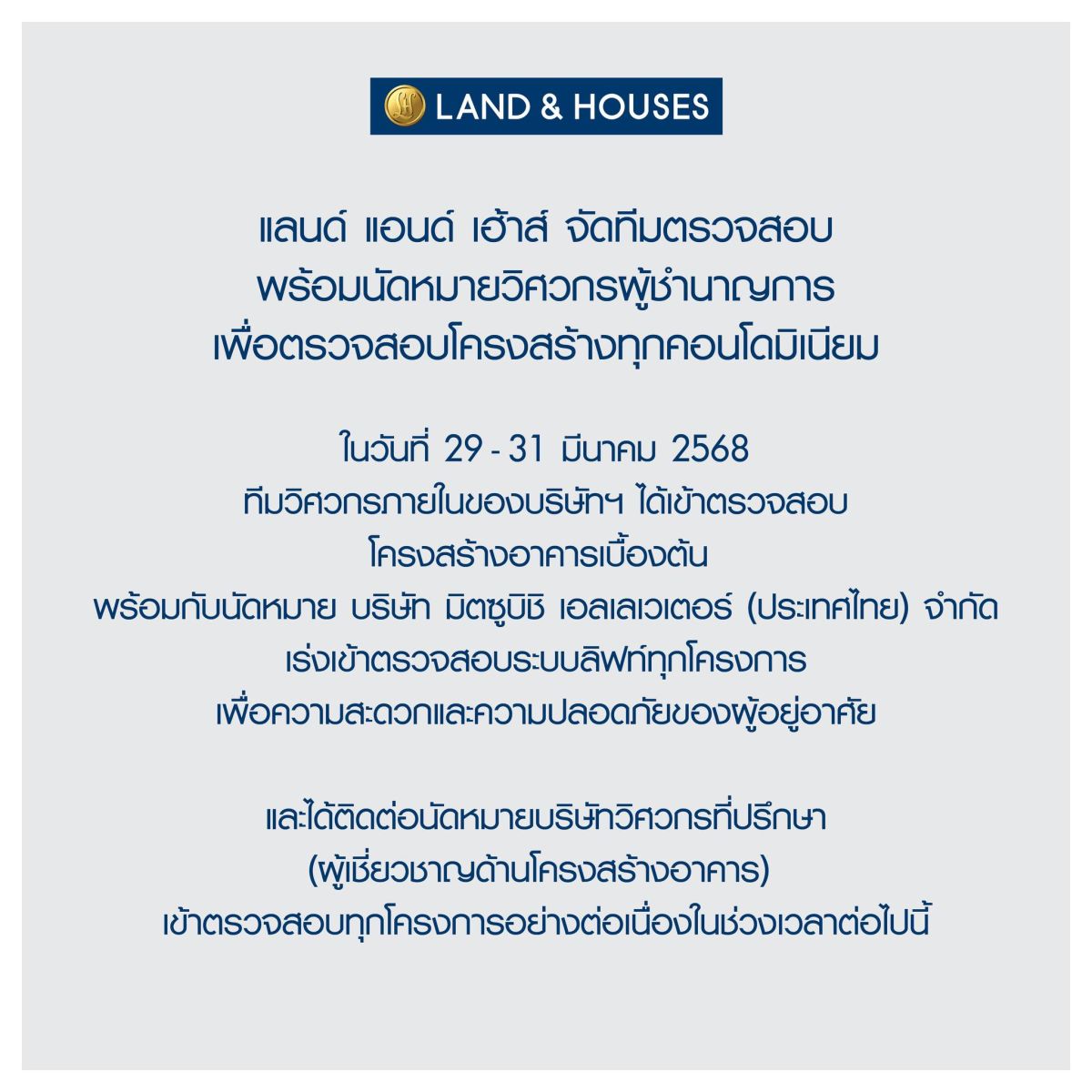 แลนด์ แอนด์ เฮ้าส์ จัดทีมตรวจสอบ พร้อมนัดหมายวิศวกรผู้ชำนาญการ เพื่อตรวจสอบโครงสร้างทุกคอนโดมิเนียม