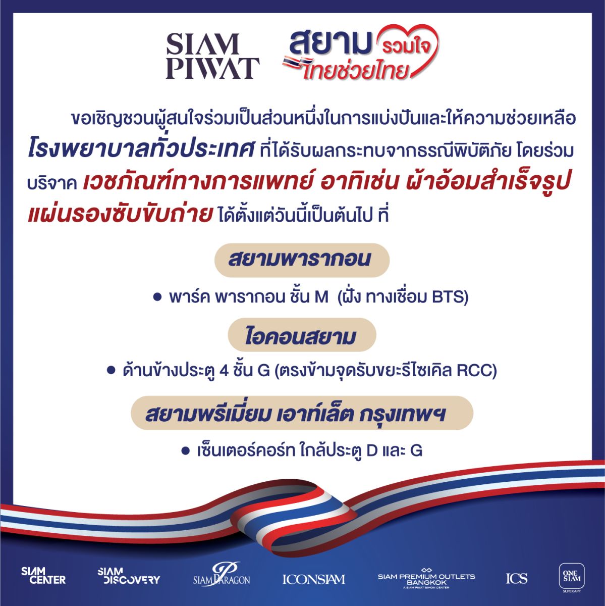 สยามพิวรรธน์ เจ้าของและผู้บริหาร สยามพารากอน สยามเซ็นเตอร์ สยามดิสคัฟเวอรี่ หนึ่งในพันธมิตรเจ้าของไอคอนสยาม และสยามพรีเมี่ยม เอาท์เล็ต กรุงเทพฯ เดินหน้าสานต่อปณิธานการขับเคลื่อนธุรกิจที่เอื้ออำนวยประโยชน์ให้กับผู้คน ชุมชน และสังคม ภายใต้แพลตฟอร์มแห่งโอกาสเพื่อการเติบโตของทุกคน ผนึกกำลังพันธมิตรทางธุรกิจ ผู้เช่า ผู้ใช้บริการ และประชาชนทั่วไป เปิดศูนย์กลางรับบริจาคเวชภัณฑ์ทางการแพทย์ ภายใต้โครงการ “สยามรวมใจ ไทยช่วยไทย” เพื่อช่วยเหลือโรงพยาบาลทั่วประเทศที่ได้รับผลกระทบจากเหตุการณ์ธรณีพิบัติภัย โดยเปิดพื้นที่ศูนย์กลางการรับบริจาคดังนี้