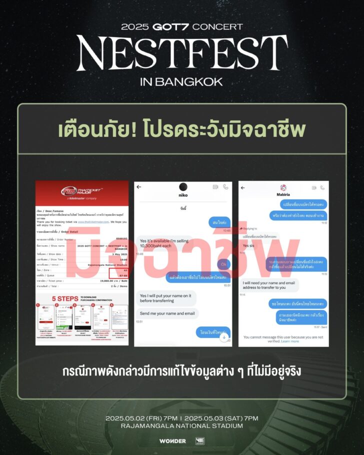ขณะที่เพจ "411ent" หรือ ผู้จัด โฟร์ วัน วัน เอ็นเตอร์เทนเม้นท์ (Four One OneEntertainment หรือ 411ent) ของ กึ้ง-เฉลิมชัย มหากิจศิริ โพสต์ข้อความเตือนภัยว่า "ขณะนี้ทางผู้จัดฯ ได้ตรวจพบการปลอมแปลงหลักฐานคำสั่งซื้อบัตร #GOT7_NESTFESTinBKK เพื่อนำมาจำหน่าย