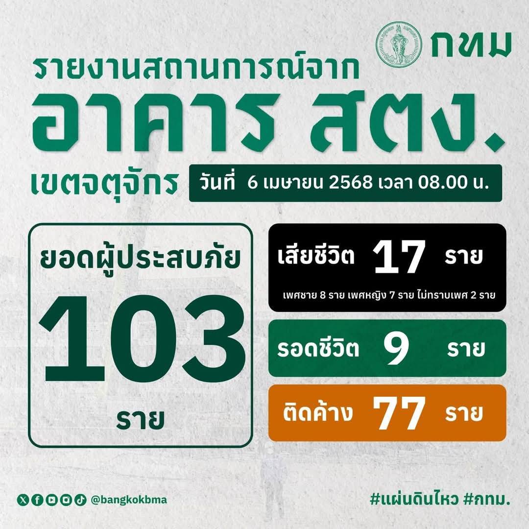 ด้านเพจกรุงเทพมหานคร มีการรายงานสถานการณ์การรื้อถล่ม กู้ร่างผู้เสียชีวิตจากซากอาคาร สตง. เขตจตุจักร โดยตัวเลขวันที่ 6 เมษายน 2568 เวลา 08.00 น. ยอดผู้ประสบภัย103ราย เสียชีวิต17ราย รอดชีวิต 9 ราย ติดค้าง 77 ราย