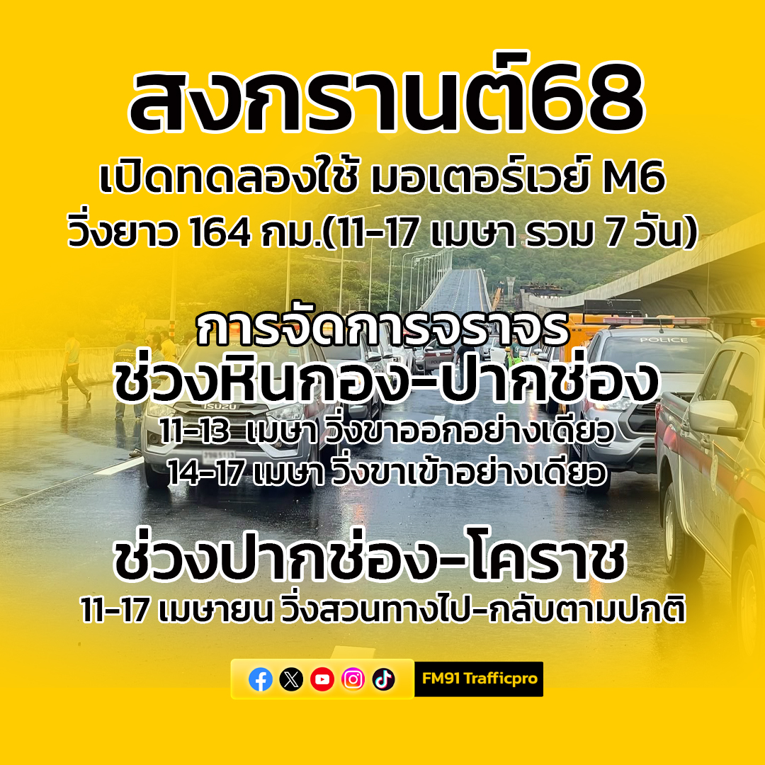 7 เมษายน 2568 ศูนย์รวมข่าวจราจร สวพ.FM91 ในช่วงเทศกาลหยุดยาวสงกรานต์ 2568 ที่ประชาชนจะเดินทางกลับภูมิลำเนาและท่องเที่ยวเป็นจำนวนมาก เจ้าหน้าที่หน่วยงานที่เกี่ยวข้องได้มีการเตรียมพร้อมเพื่ออำนวยความสะดวกให้กับพี่น้องปชช. และโดยเฉพาะอย่างยิ่ง มอเตอร์เวย์ M6 (ช่วงหินกอง-ปากช่อง) ซึ่งเป็นปีแรกที่กรมทางหลวง ได้เปิดทดลองให้ปชช.วิ่งฟรี โดยจะเปิดให้ปชช.ใช้ตั้งแต่ 00.01 น. ของวันที่ 11 เมษายน เป็นต้นไป จนถึง วันที่ 17 เมษายน เวลา 24.00 น. (ตลอด 24 ชั่วโมง)