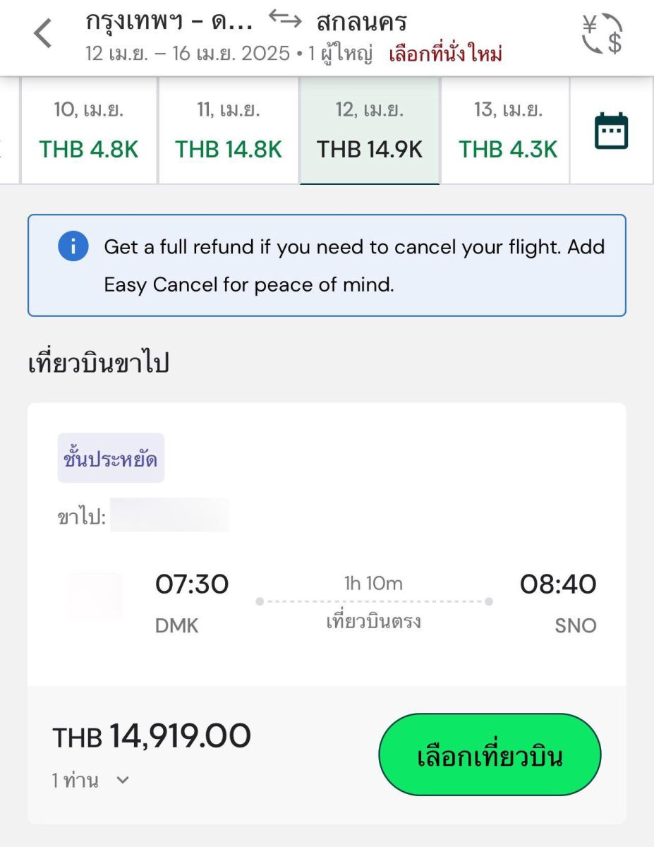 โดยผู้โพสต์ได้กดจองตั๋วสายการบินโลว์คอสต์เจ้าหนึ่ง วันที่ 14 เม.ย.68 เที่ยวบินจาก ท่าอากาศยานดอนเมือง (กทม.) ไปท่าอากาศยานสกลนคร ช่วงเวลา 07.30-08.40 น. แต่เมื่อลองเช็กราคาปรากฏว่าค่าตั๋วสูงถึง 14,919 บาท (หนึ่งหมื่นสี่พันเก้าร้อยสิบเก้าบาท)