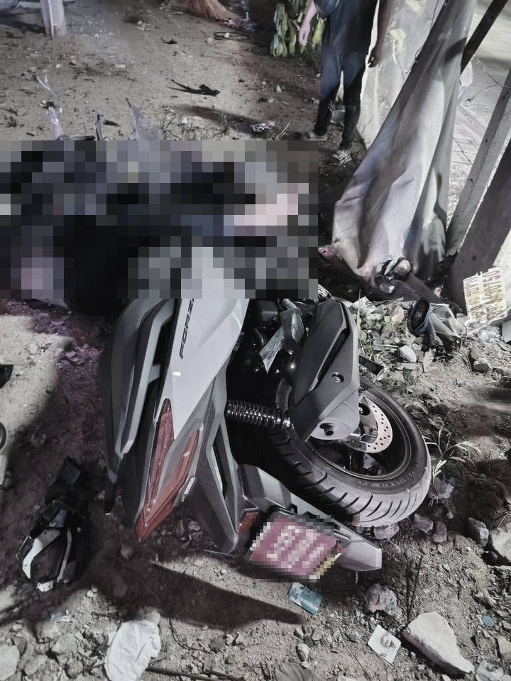 ที่เกิดเหตุ พบรถจักรยานยนต์ ยี่ห้อ ฮอนด้า ฟอร์ซ่า สีเทาหมายเลขทะเบียน ป้ายแดง สภ.ศรีราชา ลักษณะชนเข้ากับเสาไฟฟ้าข้างทาง ได้รับความเสียหาย และใกล้กันพบร่างของผู้บาดเจ็บ 1 ราย มีอาการสาหัส ทางอาสาสมัครเร่งช่วยเหลือปั๊มหัวใจ แต่ไม่เป็นผล เสียชีวิตในเวลาต่อมา ตรวจสอบ เป็นผู้ชาย อายุประมาณ 30 - 35 ปี ไม่พบเอกสารติดตัว